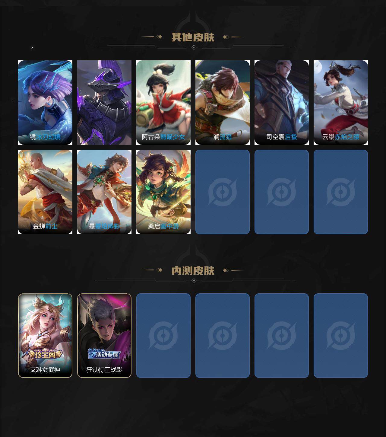 扁鹊炼金王,虞姬凯尔特女王,白起狰,太乙真人饕餮,曹操烛龙,芈月重明,典韦穷奇,狂铁御狮,米莱狄御霄,牛魔御旌,盾山御銮,夏侯惇朔风刀,明世隐疑决卦,老夫子醍醐杖,鬼谷子原初探秘者,狄仁杰万华元夜,程咬金演武夺筹,钟馗驱傩正仪,苏烈千军破阵,吕布猎兽之王,嬴政白昼王子,女娲朔望之晖,典韦蓝屏警告,钟馗神迹守卫,鲁班七号狮舞东方,沈梦溪星空之诺,李元芳银河之约,刘邦夺宝奇兵,马可波罗暗影游猎,蒙犽狂想玩偶喵,元歌云间偶戏,弈星混沌棋,达摩沙漠行僧,沈梦溪大漠名商,李元芳云中旅人,鲁班大师探海日志,张良古海寻踪