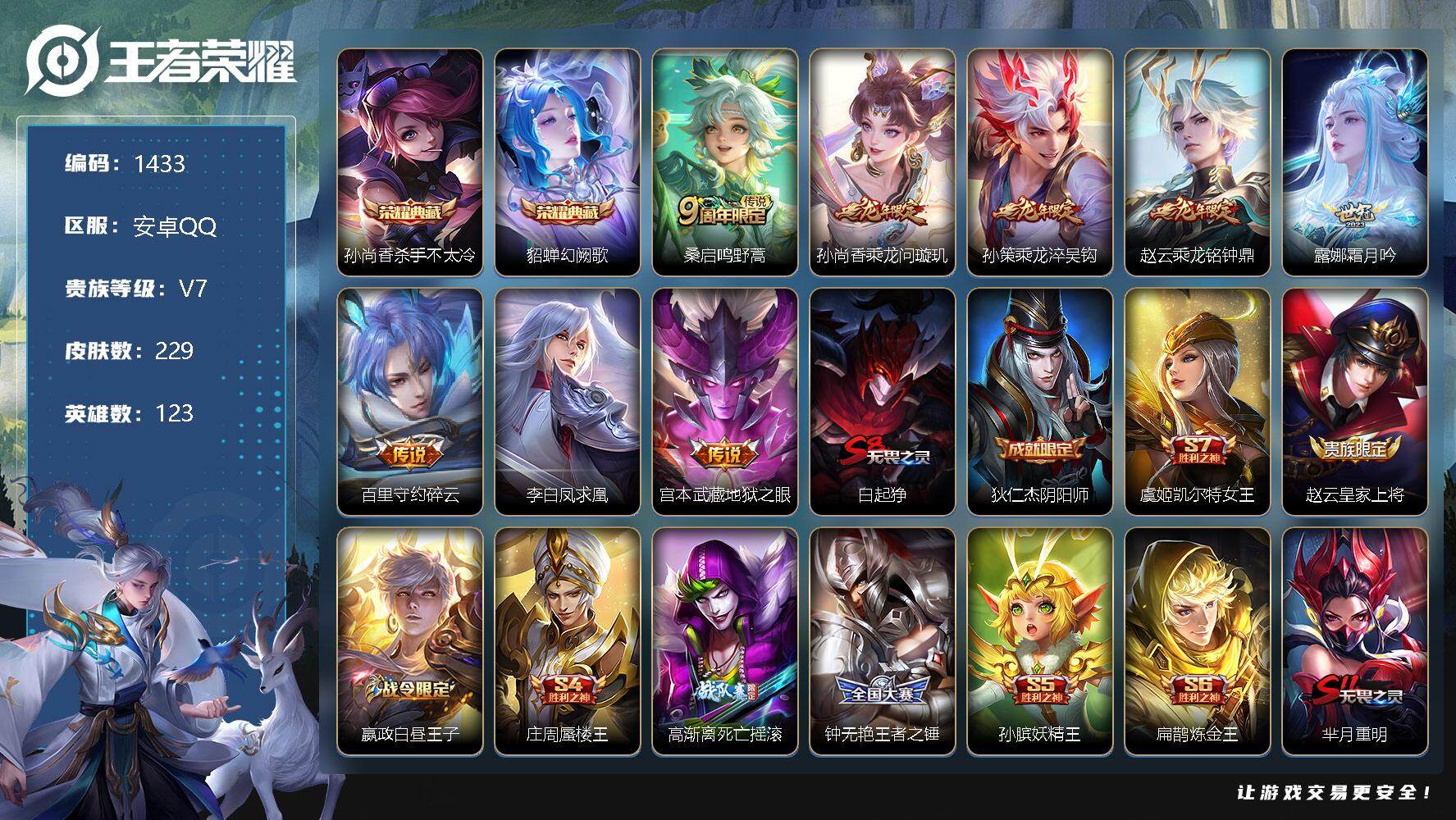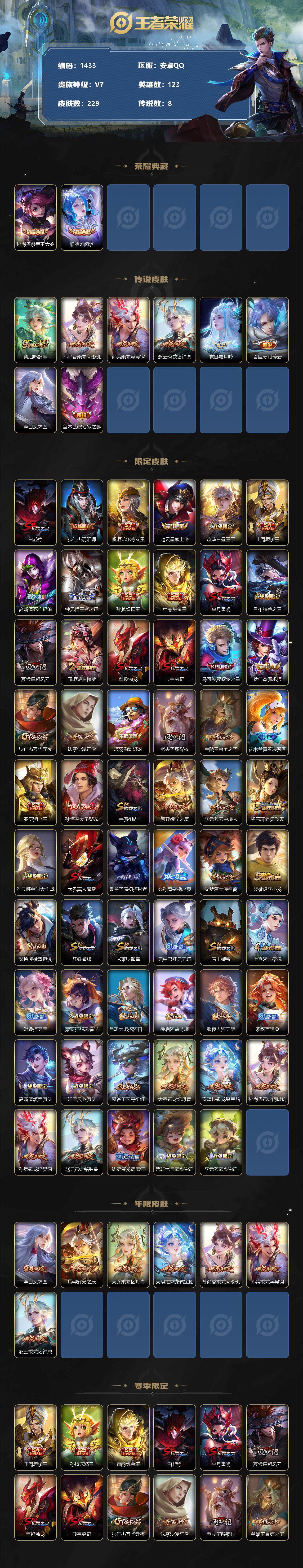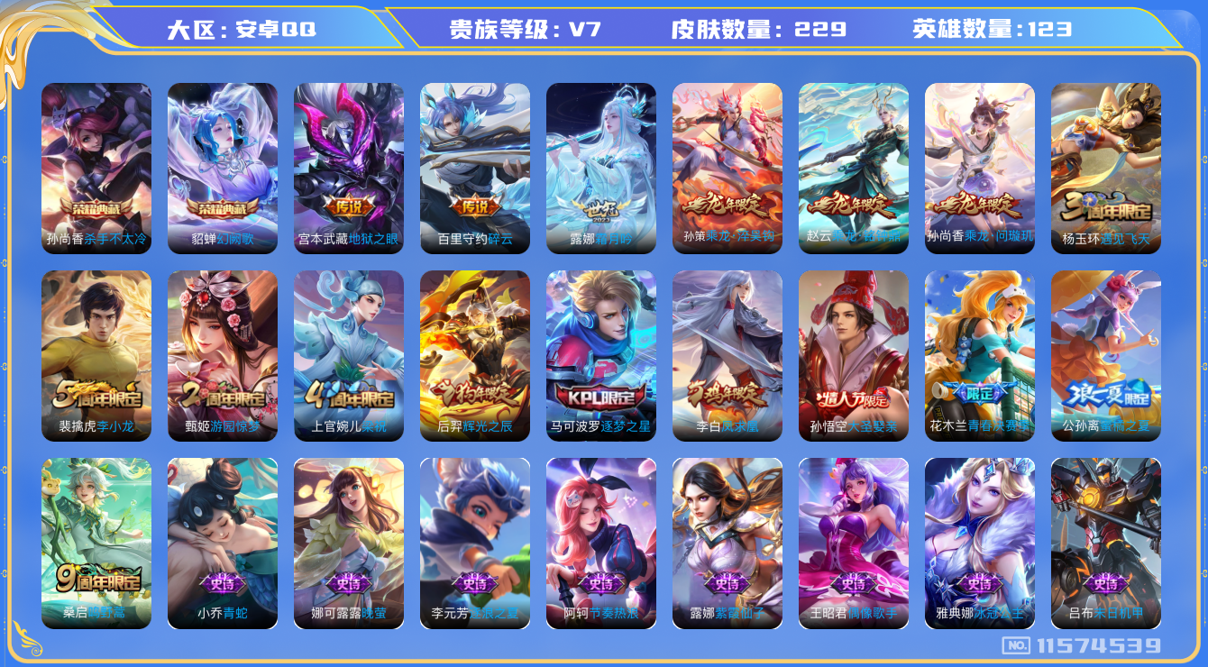 [11574539]【商品标题】:安卓Q-V7-最强王者段位-123英雄-229皮肤-2典藏-0珍品无双-0无双-0珍品传说-8传说-53史诗