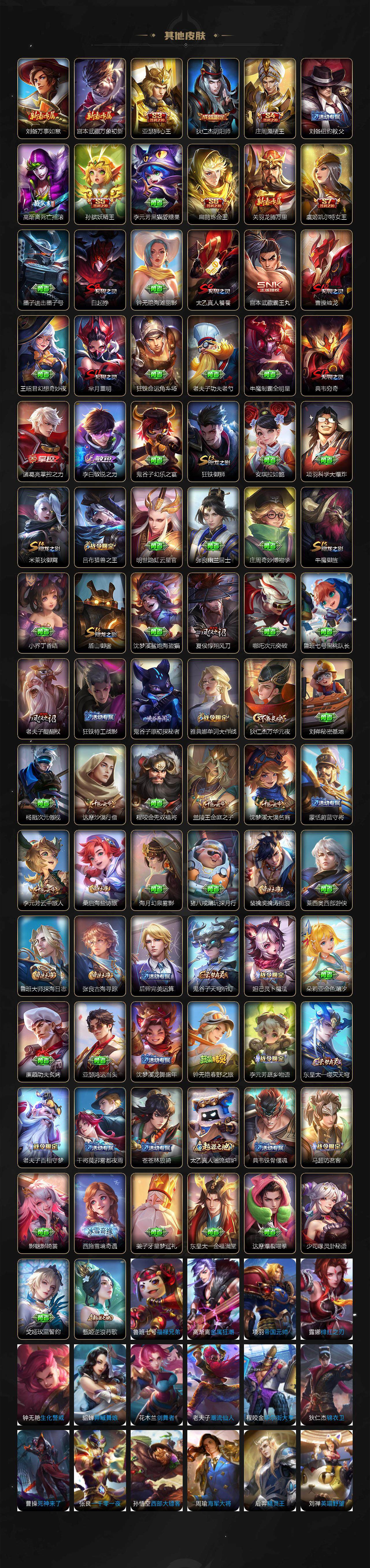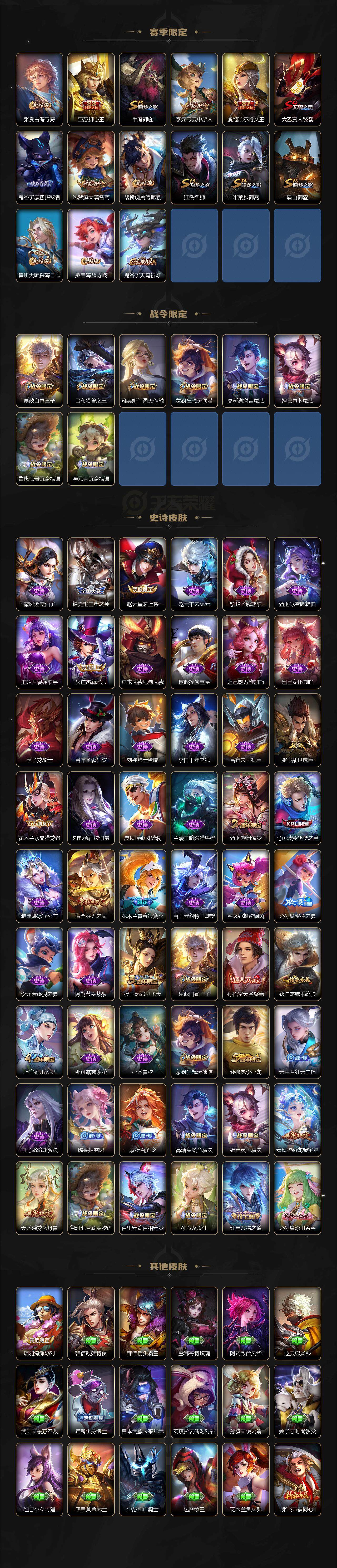 【限定皮肤】:白起狰,狄仁杰阴阳师,虞姬凯尔特女王,赵云皇家上将,嬴政白昼王子,庄周蜃楼王,高渐离死亡摇滚,钟无艳王者之锤,孙膑妖精王,扁鹊炼金王,芈月重明,吕布猎兽之王,夏侯惇朔风刀,甄姬游园惊梦,曹操烛龙,典韦穷奇,马可波罗逐梦之星,狄仁杰魔术师,狄仁杰万华元夜,达摩沙漠行僧,项羽海滩派对,老夫子醍醐杖,兰陵王金庭之子,花木兰青春决赛季,亚瑟狮心王,孙悟空大圣娶亲,牛魔御旌,后羿辉光之辰,李元芳云中旅人,杨玉环遇见飞天,雅典娜单词大作战,太乙真人饕餮,鬼谷子原初探秘者,公孙离蜜橘之夏,沈梦溪大漠名商,裴擒虎李小龙,裴擒虎擒涛扼浪,狂铁御狮,米莱狄御霄,云中君纤云弄巧,盾山御銮,上官婉儿梁祝,嫦娥拒霜思,蒙犽狂想玩偶喵,鲁班大师探海日志,桑启海盐诗旅,张良古海寻踪,蒙犽百解令,高渐离燃音魔法,妲己灵卜魔法,鬼谷子天穹祈灯,大乔乘龙忆丹青,安琪拉乘龙聚宝船,孙尚香乘龙问璇玑,孙策乘龙淬吴钩,赵云乘龙铭钟鼎,沈梦溪龙舞盛年,鲁班七号蔬乡物语,李元芳蔬乡物语