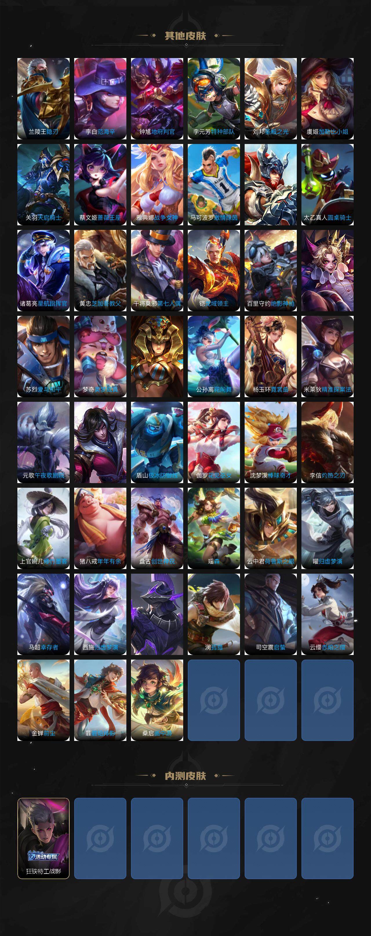 【赛季限定】:庄周蜃楼王,孙膑妖精王,扁鹊炼金王,白起狰,芈月重明,夏侯惇朔风刀,曹操烛龙,典韦穷奇,狄仁杰万华元夜,达摩沙漠行僧,老夫子醍醐杖,兰陵王金庭之子,张良古海寻踪,亚瑟狮心王,牛魔御旌,李元芳云中旅人,虞姬凯尔特女王,太乙真人饕餮,鬼谷子原初探秘者,沈梦溪大漠名商,裴擒虎擒涛扼浪,狂铁御狮,米莱狄御霄,盾山御銮,鲁班大师探海日志,桑启海盐诗旅,鬼谷子天穹祈灯