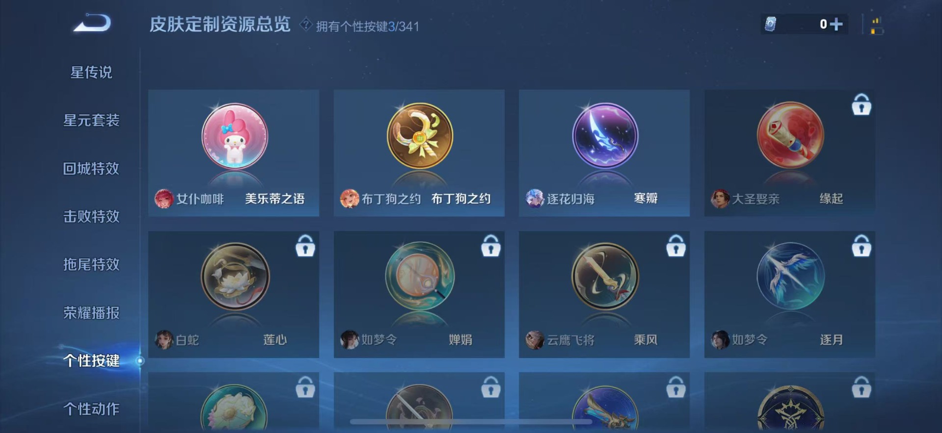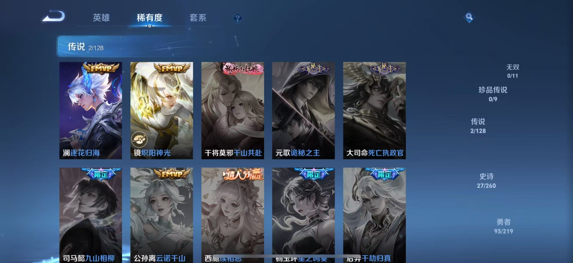 夏侯惇朔风刀,老夫子醍醐杖,沈梦溪大漠名商,盾山御銮,曹操烛龙,苏烈千军破阵,典韦穷奇,达摩沙漠行僧,牛魔御旌,兰陵王金庭之子,裴擒虎擒涛扼浪,鲁班大师探海日志,明世隐疑决卦,鬼谷子原初探秘者,桑启海盐诗旅,狄仁杰万华元夜,芈月重明,程咬金演武夺筹,李元芳云中旅人,弈星混沌棋,米莱狄御霄,钟馗驱傩正仪,狂铁御狮,太乙真人饕餮