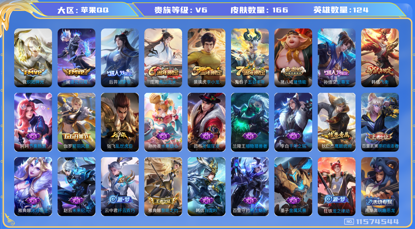 [11574544]V6 2传说 124英雄 166皮肤 可修改实名 优质装备:炽阳神光,澜逐花归海 珍宝阁皮:玩趣恶龙 限定皮:至尊宝,飞衡(韩信年限),高山流水,五谷丰年,李小龙,如梦令-后羿,猪悟能 史诗皮:龙之律动,白龙吟,特工魅影,千年之狐,冰冠公主,乱世虎臣,节奏热浪,水果甜心,暗隐猎兽者,纤云弄巧,箭羽风息,金属风暴,原初追逐者,圣诞狂欢,鹰眼统帅,黎明之约,未来纪元-赵云