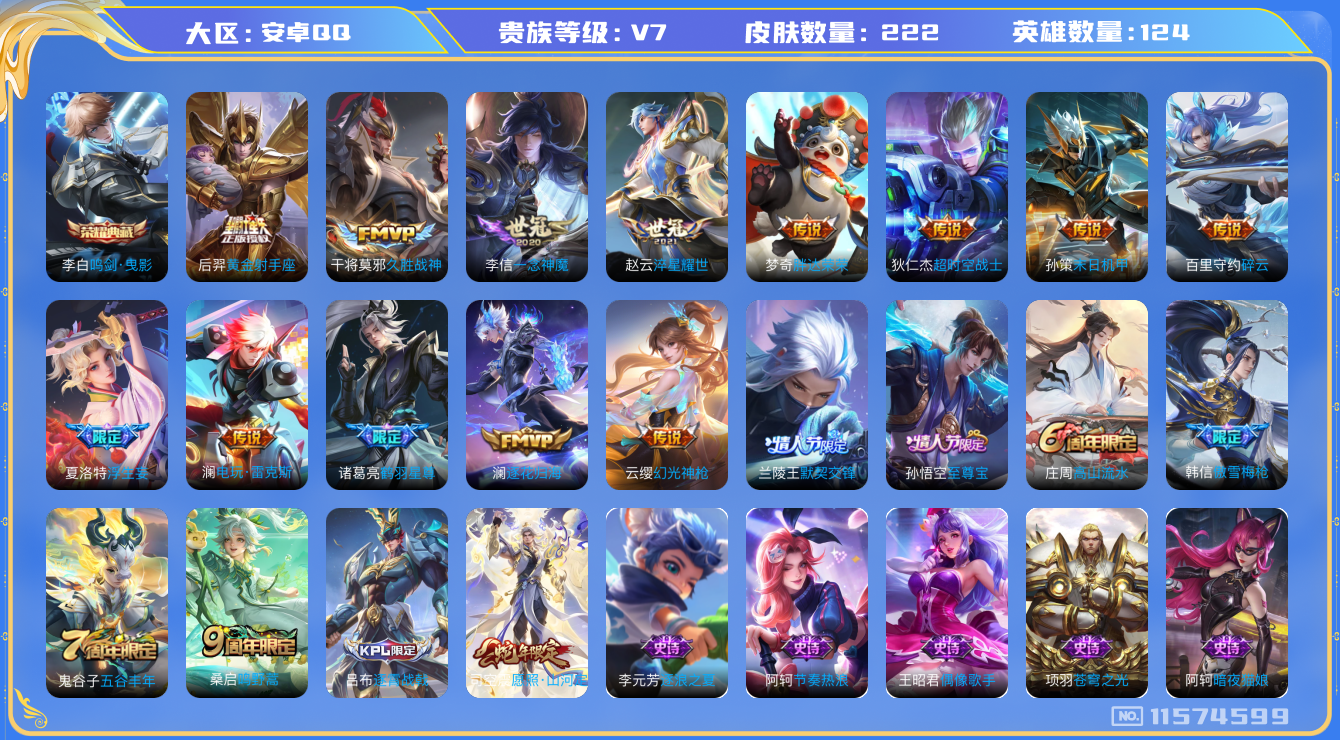 [11574599]【商品标题】:安卓Q-V7-至尊星耀V段位-124英雄-222皮肤-1典藏-0珍品无双-0无双-0珍品传说-16传说-63史诗