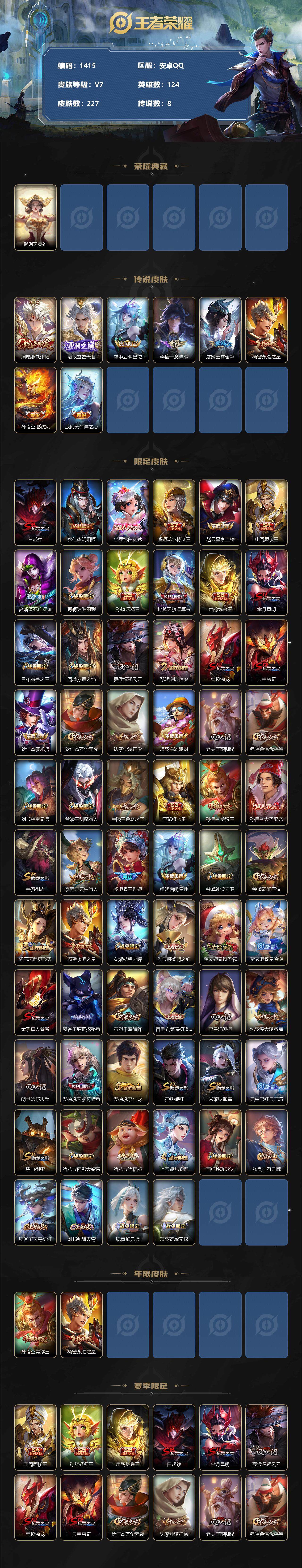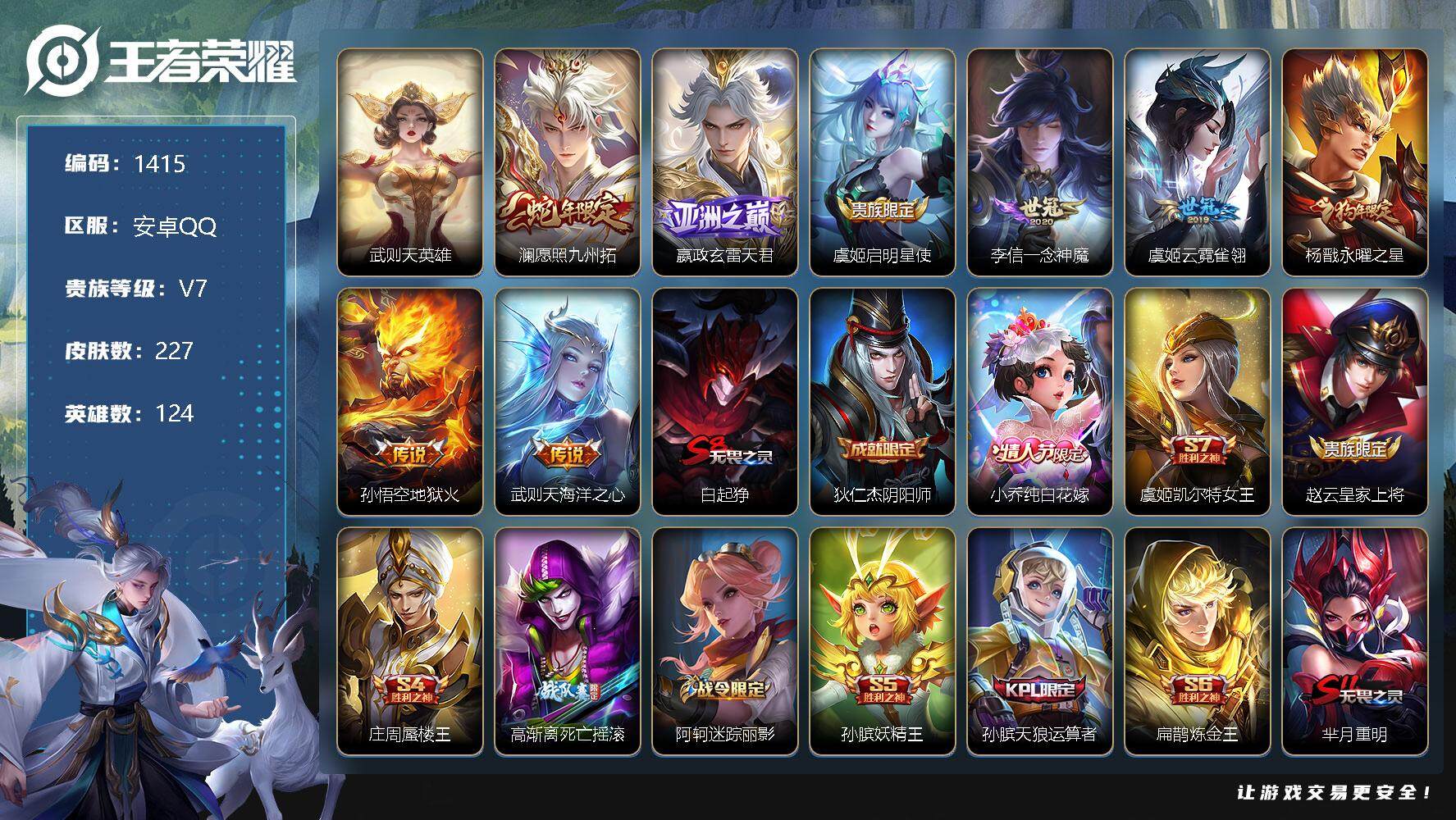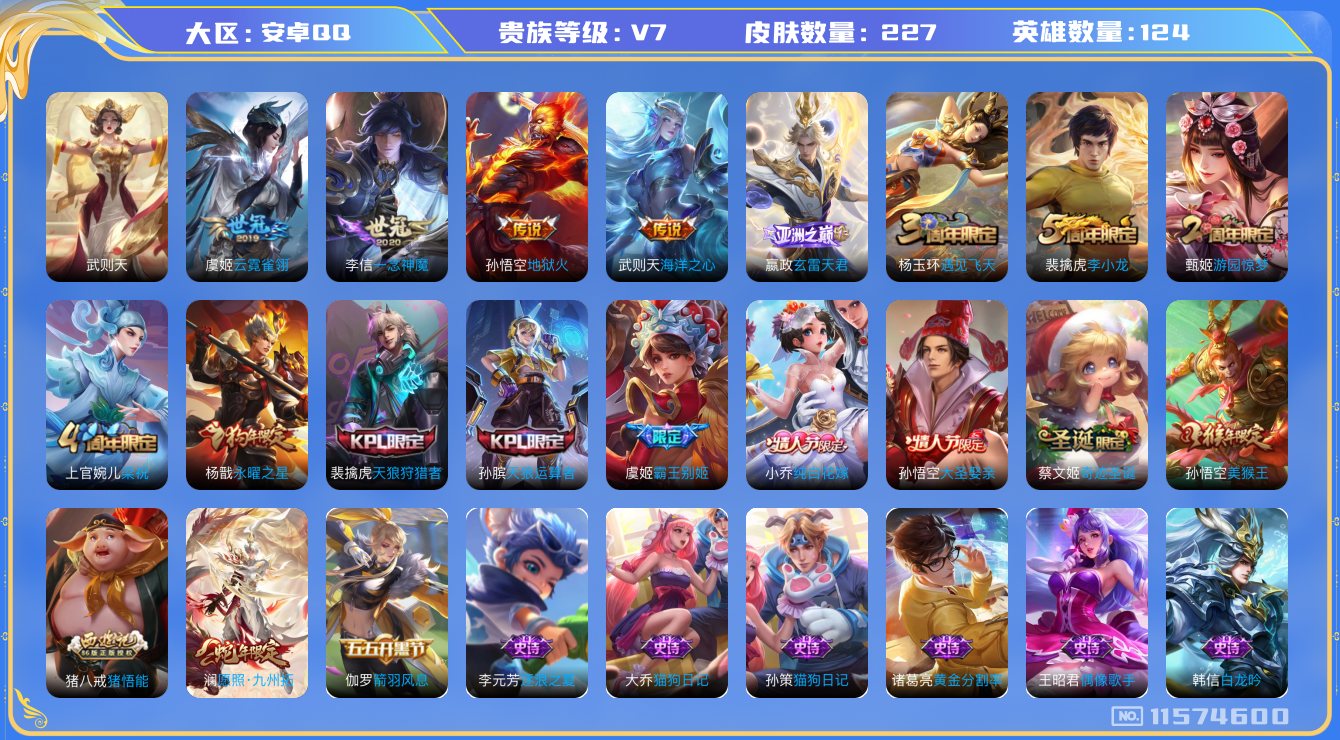 [11574600]【商品标题】:安卓Q-V7-永恒钻石I段位-124英雄-227皮肤-0典藏-0珍品无双-0无双-0珍品传说-8传说-55史诗