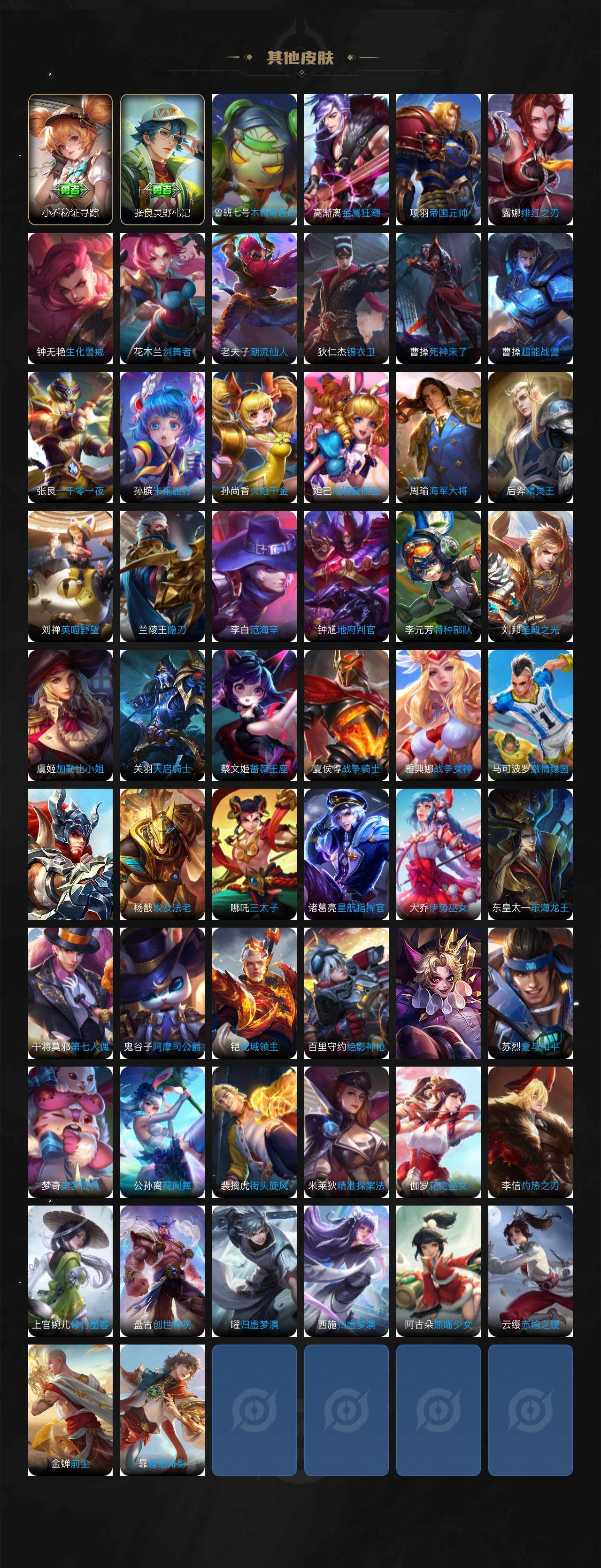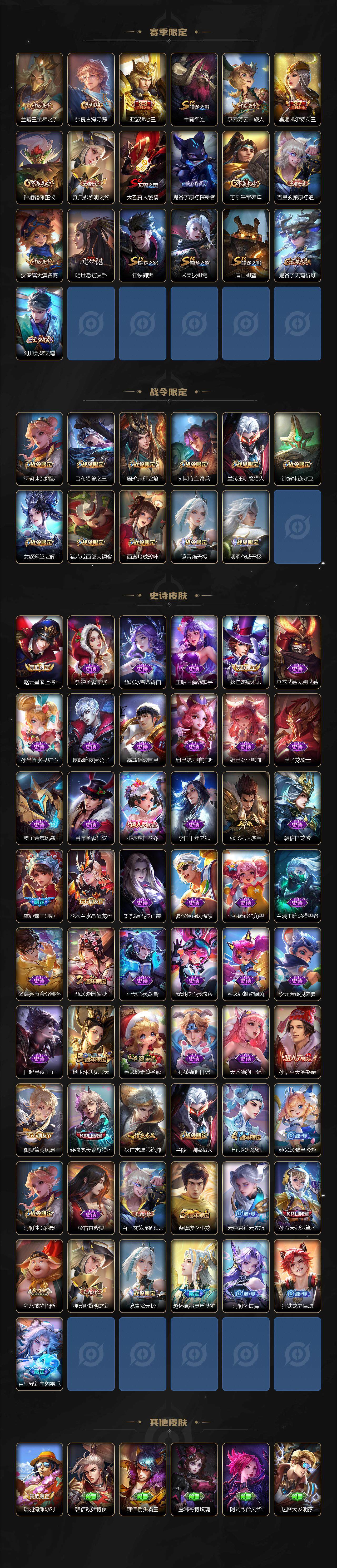 【限定皮肤】:白起狰,狄仁杰阴阳师,小乔纯白花嫁,虞姬凯尔特女王,赵云皇家上将,庄周蜃楼王,高渐离死亡摇滚,阿轲迷踪丽影,孙膑妖精王,孙膑天狼运算者,扁鹊炼金王,芈月重明,吕布猎兽之王,周瑜赤莲之焰,夏侯惇朔风刀,甄姬游园惊梦,曹操烛龙,典韦穷奇,狄仁杰魔术师,狄仁杰万华元夜,达摩沙漠行僧,项羽海滩派对,老夫子醍醐杖,程咬金演武夺筹,刘邦夺宝奇兵,兰陵王驯魔猎人,兰陵王金庭之子,亚瑟狮心王,孙悟空美猴王,孙悟空大圣娶亲,牛魔御旌,李元芳云中旅人,虞姬霸王别姬,虞姬启明星使,钟馗神迹守卫,钟馗驱傩正仪,杨玉环遇见飞天,杨戬永曜之星,女娲朔望之晖,雅典娜黎明之约,蔡文姬奇迹圣诞,蔡文姬繁星吟游,太乙真人饕餮,鬼谷子原初探秘者,苏烈千军破阵,百里玄策原初追逐者,弈星混沌棋,沈梦溪大漠名商,明世隐疑决卦,裴擒虎天狼狩猎者,裴擒虎李小龙,狂铁御狮,米莱狄御霄,云中君纤云弄巧,盾山御銮,猪八戒西部大镖客,猪八戒猪悟能,上官婉儿梁祝,西施玲珑珍味,张良古海寻踪,鬼谷子天穹祈灯,刘邦剑破天穹,镜青焰无极,项羽苍威无极