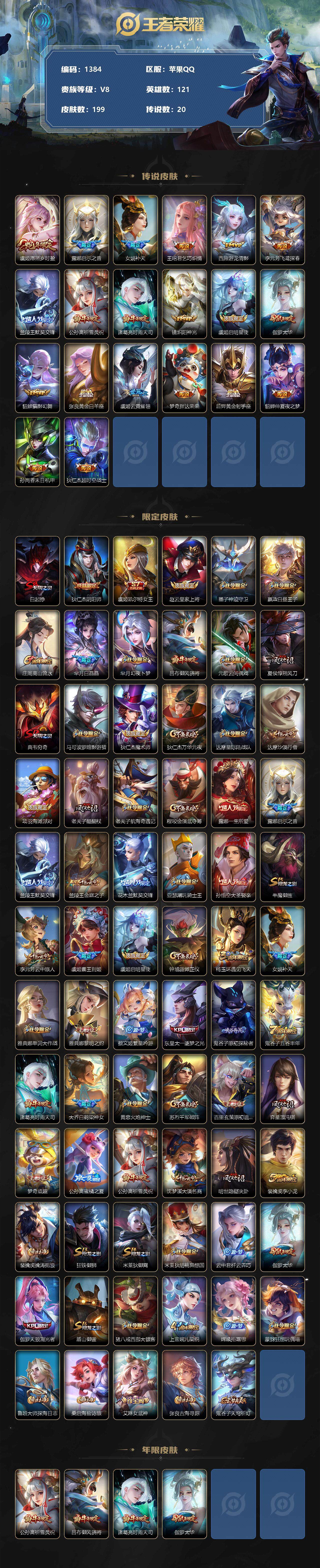 [11574611]【商品标题】:苹果Q-V2-荣耀黄金I段位-121英雄-199皮肤-0典藏-0珍品无双-0无双-0珍品传说-20传说-59史诗