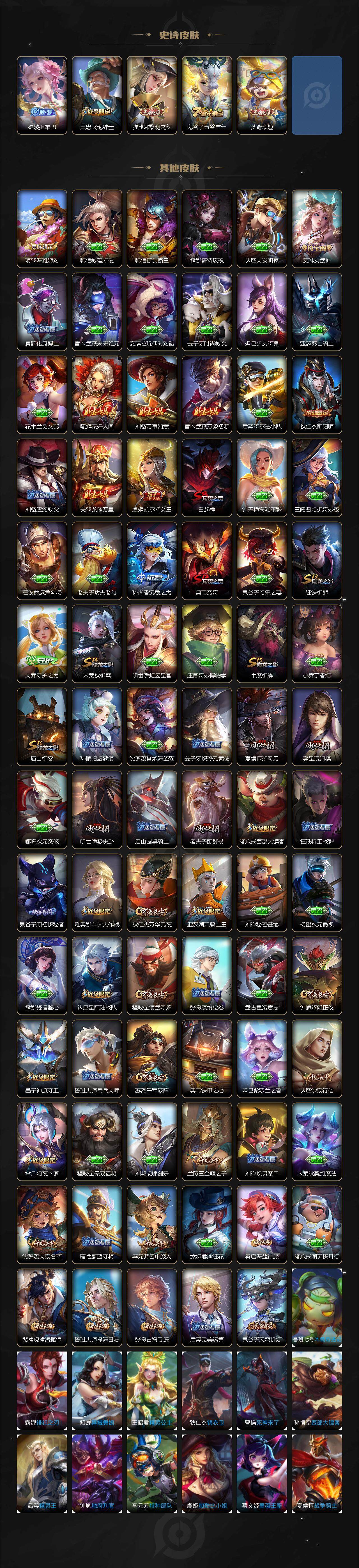 虞姬凯尔特女王,白起狰,典韦穷奇,狂铁御狮,米莱狄御霄,牛魔御旌,盾山御銮,夏侯惇朔风刀,明世隐疑决卦,老夫子醍醐杖,鬼谷子原初探秘者,狄仁杰万华元夜,程咬金演武夺筹,钟馗驱傩正仪,苏烈千军破阵,嬴政白昼王子,马可波罗暗影游猎,蒙犽狂想玩偶喵,元歌云间偶戏,弈星混沌棋,达摩沙漠行僧,兰陵王金庭之子,沈梦溪大漠名商,李元芳云中旅人,桑启海盐诗旅,裴擒虎擒涛扼浪,鲁班大师探海日志,张良古海寻踪