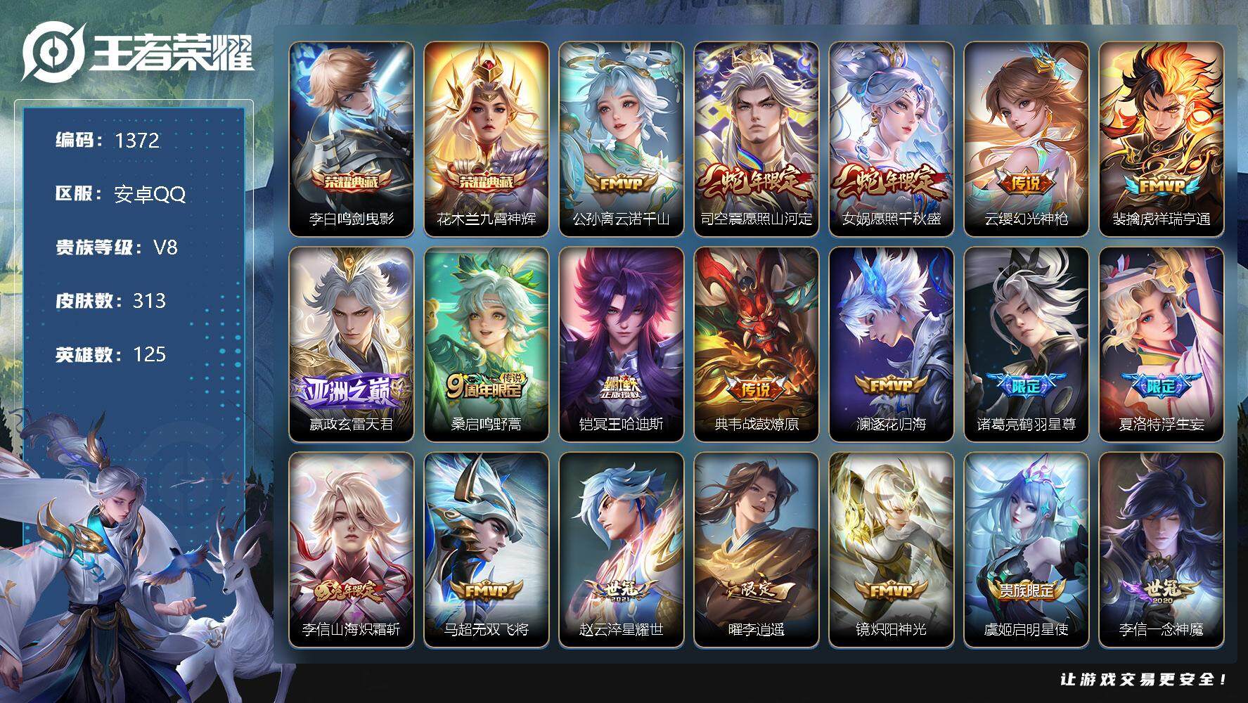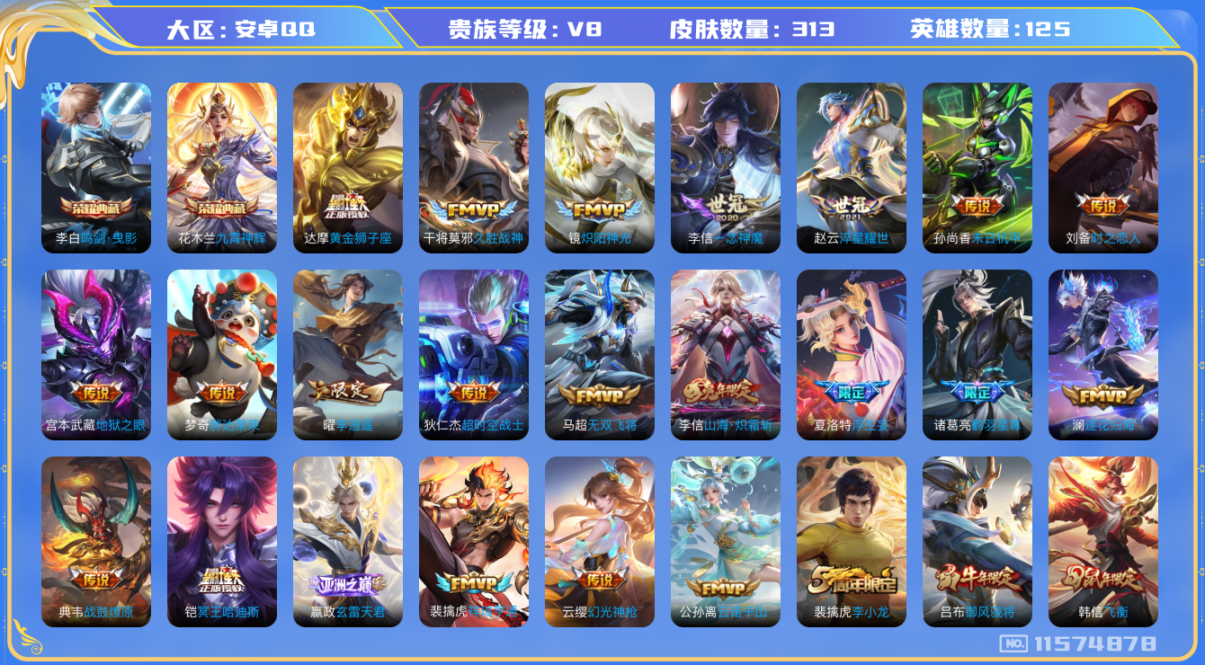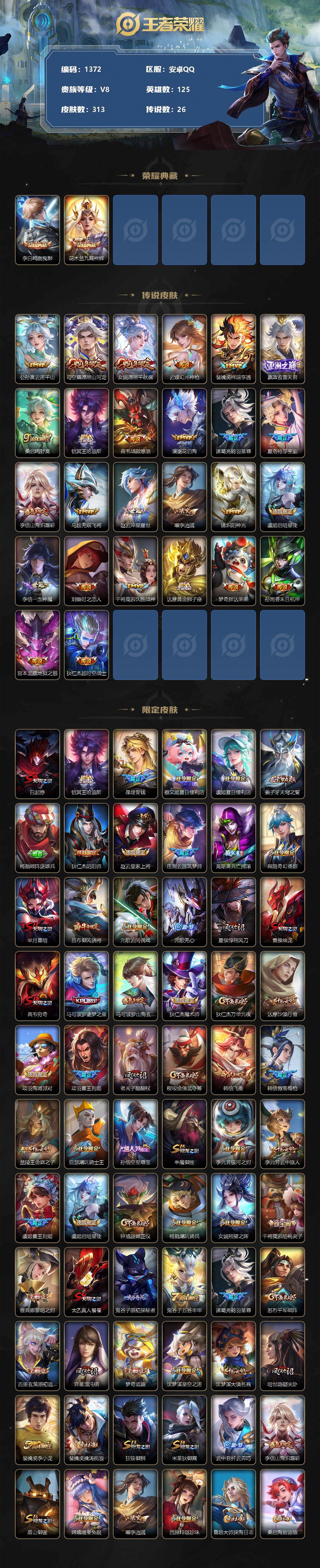 [11574878]【商品标题】:安卓Q-V8-最强王者段位-125英雄-313皮肤-2典藏-0珍品无双-0无双-0珍品传说-26传说-89史诗