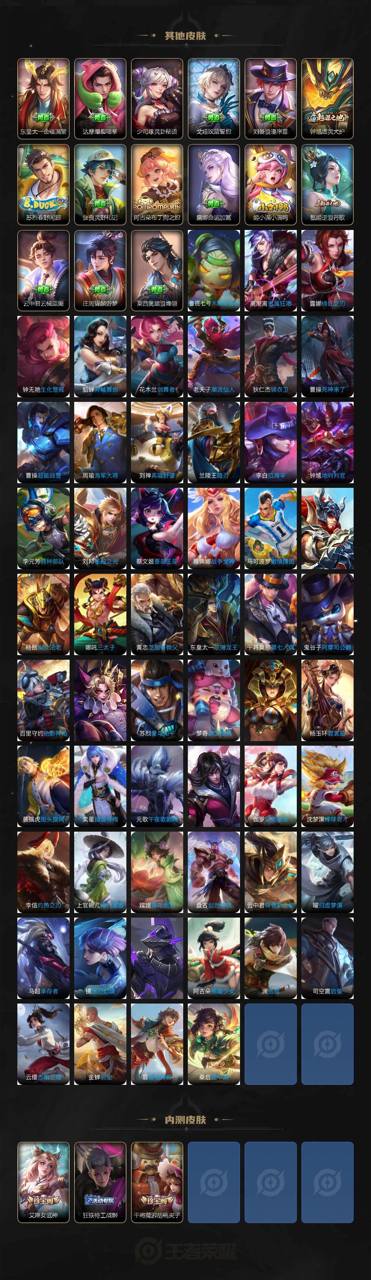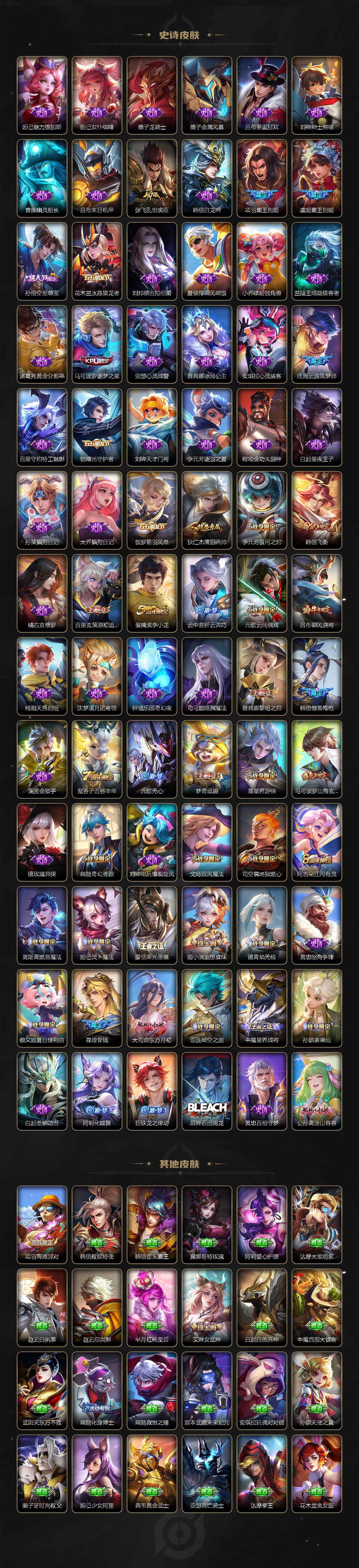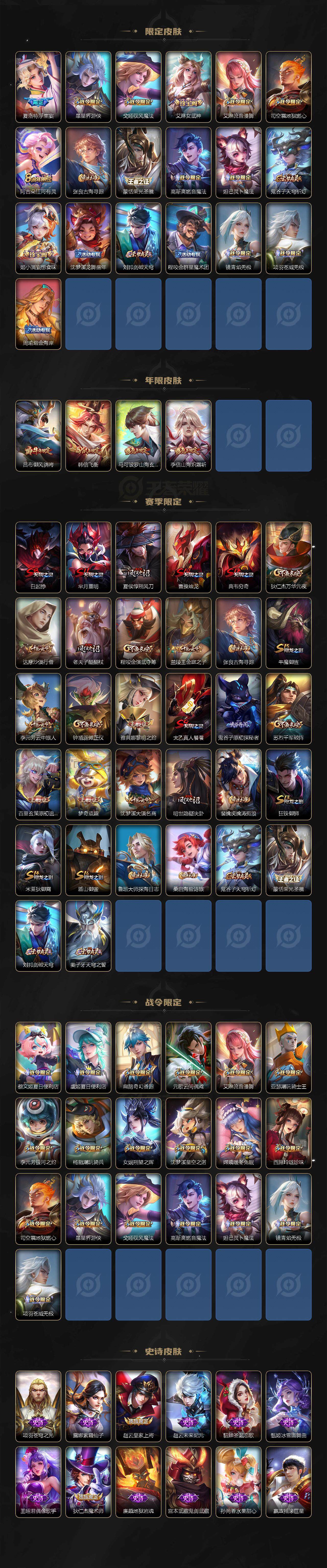 【限定皮肤】:白起狰,铠冥王哈迪斯,暃埋骨钱,蔡文姬夏日便利店,虞姬夏日便利店,姜子牙天穹之誓,杨戬破阵退雄兵,狄仁杰阴阳师,赵云皇家上将,庄周云端筑梦师,高渐离死亡摇滚,扁鹊奇幻香踪,芈月重明,吕布御风骁将,元歌云间偶戏,元歌无心,夏侯惇朔风刀,曹操烛龙,典韦穷奇,马可波罗逐梦之星,马可波罗山海玄木吟,狄仁杰魔术师,狄仁杰万华元夜,达摩沙漠行僧,项羽海滩派对,项羽霸王别姬,老夫子醍醐杖,程咬金演武夺筹,韩信飞衡,韩信傲雪梅枪,兰陵王金庭之子,亚瑟潮玩骑士王,孙悟空至尊宝,牛魔御旌,李元芳银河之约,李元芳云中旅人,虞姬霸王别姬,虞姬启明星使,钟馗驱傩正仪,杨戬潮玩骑兵,女娲朔望之晖,干将莫邪胡桃夹子,雅典娜黎明之约,太乙真人饕餮,鬼谷子原初探秘者,鬼谷子五谷丰年,诸葛亮鹤羽星尊,苏烈千军破阵,百里玄策原初追逐者,弈星混沌棋,梦奇顽趣,沈梦溪星空之诺,沈梦溪大漠名商,明世隐疑决卦,裴擒虎李小龙,裴擒虎擒涛扼浪,狂铁御狮,米莱狄御霄,云中君纤云弄巧,李信山海炽霜斩,盾山御銮,嫦娥暖冬兔眠,曜李逍遥 ,西施玲珑珍味,鲁班大师探海日志,桑启海盐诗旅,夏洛特浮生妄,暃星界游侠,戈娅驭风魔法,艾琳女武神,艾琳流音漫舞,司空震地狱燃心,阿古朵江河有灵,张良古海寻踪,蒙恬荣光圣徽,高渐离燃音魔法,妲己灵卜魔法,鬼谷子天穹祈灯,姬小满妄想食味,沈梦溪龙舞盛年,刘邦剑破天穹,程咬金群星魔术团,镜青焰无极,项羽苍威无极,周瑜熔金海岸