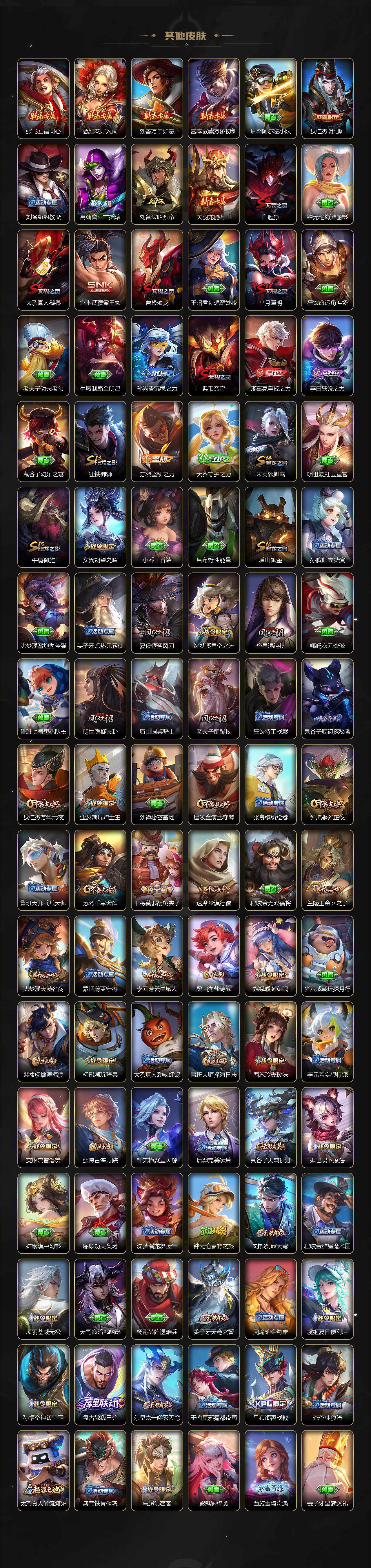 伽罗箭羽风息,李元芳逐浪之夏,大乔猫狗日记,孙策猫狗日记,露娜紫霞仙子,诸葛亮黄金分割率,王昭君偶像歌手,韩信白龙吟,项羽苍穹之光,雅典娜冰冠公主,吕布末日机甲,橘右京修罗,墨子龙骑士,嬴政摇滚巨星,刘禅绅士熊喵,刘禅天才门将,白起星夜王子,安琪拉心灵骇客,程咬金功夫厨神,刘邦德古拉伯爵,兰陵王暗隐猎兽者,曹操幽灵船长,宫本武藏鬼剑武藏,司马懿暗渊魔法,亚瑟心灵战警,钟馗乐园奇幻夜,杨戬天秀·启明,廉颇地狱岩魂,小乔缤纷独角兽,夏侯惇乘风破浪,花木兰水晶猎龙者,铠曙光守护者,墨子金属风暴,百里玄策原初追逐者,吕布圣诞狂欢,貂蝉圣诞恋歌,百里守约特工魅影,雅典娜黎明之约,澜赏金猎手,镜玫瑰异探,刘禅电玩·爆裂旋风,高渐离燃音魔法,白起苍鳞隐世