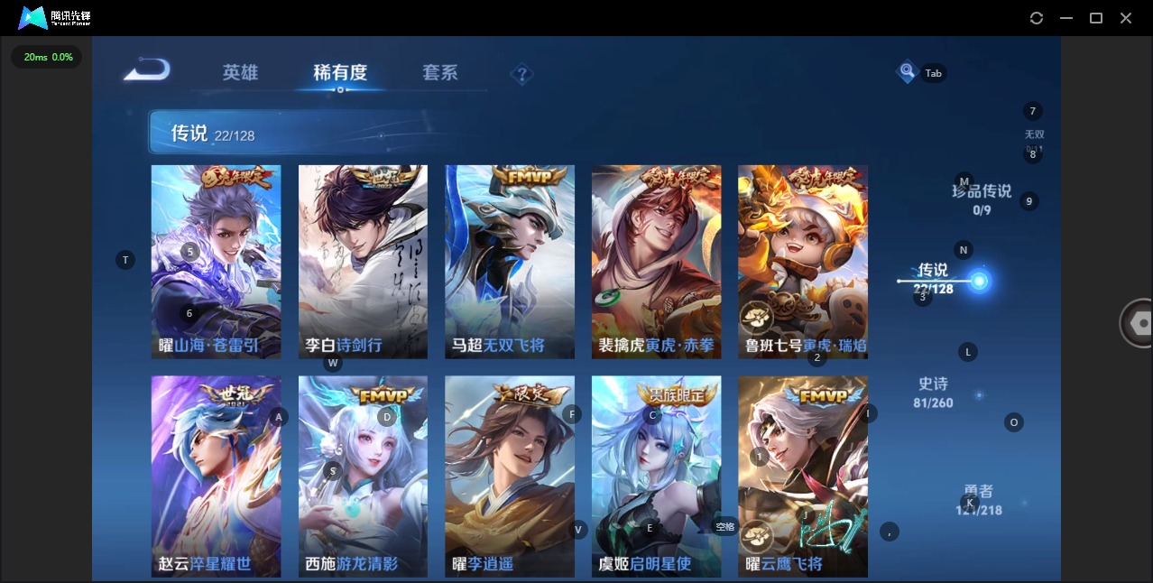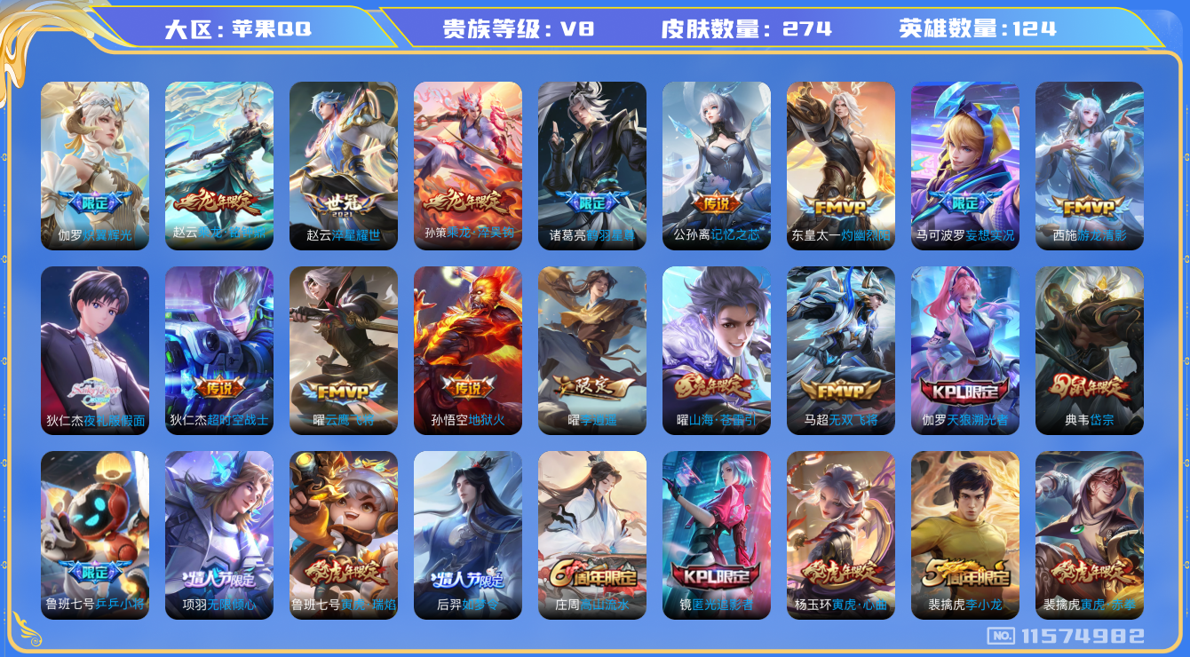 [11574982]V8 22传说 124英雄 274皮肤 可修改实名 优质装备:云鹰飞将(小将军),地狱火,李逍遥,游龙清影(小青龙),淬星耀世,超时空战士-狄仁杰,无双飞将,山海·苍雷引(电光曜子),炽翼辉光(娃娃菜牛角包),记忆之芯(机甲兔),鹤羽星尊,灼幽烈阳,妄想实况,夜礼服假面 传说皮:乘龙·铭钟鼎(赵云年限),乘龙·淬吴钩(孙策年限) 珍宝阁皮:女武神,玩趣恶龙 限定皮:白晶晶,神威(电光马子),飞衡(韩信年限),无限倾心-项羽,高山流水,诗剑行,无限倾心-虞姬,五谷丰年,梁祝,岱宗(典韦年限),天狼溯光者,李小龙,逐梦之影,如梦令-后羿,孙行者,引擎之心,乒乒小将,美猴王,匿光追影者,寅虎·瑞焰(虎皮蛋子),寅虎·心曲(虎婆),寅虎·赤拳(老虎年限),山海·玄木吟(马可年限) 史诗皮:龙之律动,石田雨龙,紫霞仙子,黄金分割率,特工魅影,千年之狐,永昼,百解令(蒙犽),高渐离燃音魔法,蒙恬荣光圣徽,匿光破解者,冰冠公主,偶像歌手,晚萤,百相守梦(刘备),百相守梦(关羽),末日机甲-吕布,乱世虎臣,修罗,女仆咖啡,摇滚巨星,水果甜心,绅士熊喵,天才门将,星夜王子,功夫厨神,德古拉伯爵,暗隐猎兽者,幽灵船长,鬼剑武藏,心灵战警,天秀·启明,地狱岩魂,诗语江南,纤云弄巧,拒霜思,乘风破浪,逐浪之夏,水晶猎龙者,曙光守护者,热力回旋,金属风暴,原初追逐者,圣诞狂欢,圣诞恋歌,鹰眼统帅,黎明之约,顽趣-阿古朵,无心,未来纪元-赵云