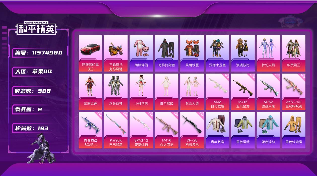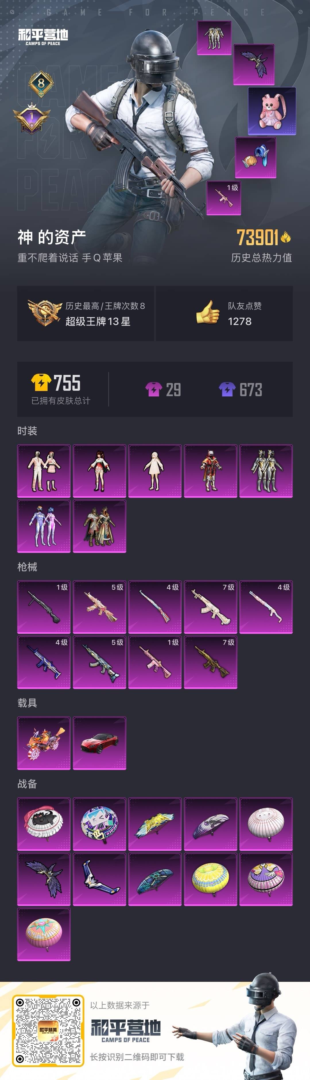 - PX_2088770- 可二次 苹果手Q-4王牌印记-9粉装-4特效枪-1载具-33055热力值-71套装-94枪皮-3卓越印记-1传奇印记, 【9粉装】,蝶舞迷情,憨憨奶龙,双星鱼跃,圣堂之誓,霞光圣骑,寒光使者,女娲灵识,萨利娅,水仙星, 【4特效枪】,M416-心之恋语-5级,M762-鬼刀-5级,Kar98K-巳巳如意-5级,UMP45-相思残雪-5级, 【2稀有紫装】,2B战斗服款,龟仙