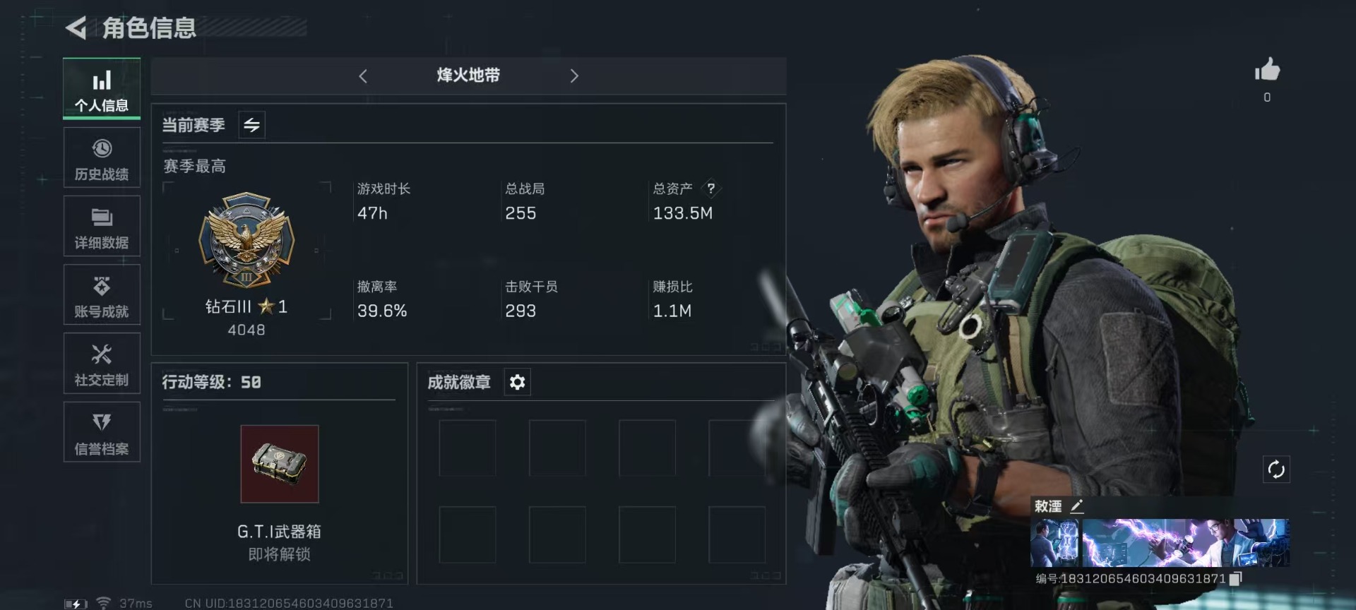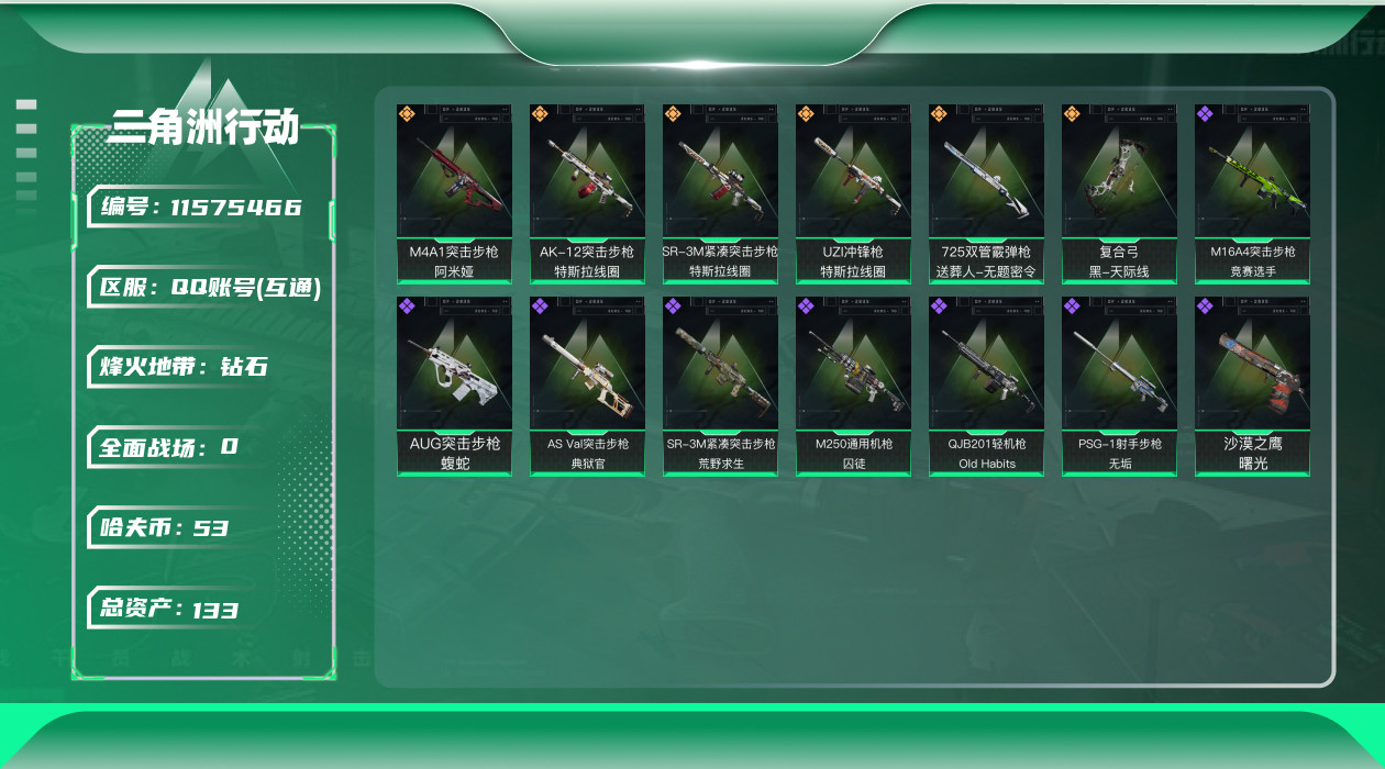 [11575466]总资产:133.5M 6传说枪械 哈夫币:53.565K 可二次 可修改实名 烽火地带段位:钻石 全面战场段位:无段位 传说武器皮肤:UZI冲锋枪-特斯拉线圈,AK-12突击步枪-特斯拉线圈,SR-3M紧凑突击步枪-特斯拉线圈,复合弓-黑-天际线,725双管霰弹枪-送葬人-无题密令,M4A1突击步枪-阿米娅 史诗武器皮肤:AUG突击步枪-蝮蛇,QJB201轻机枪-Old Habits,M16A4突击步枪-竞赛选手,M250通用机枪-囚徒,AS Val突击步枪-典狱官,PSG-1射手步枪-无垢,SR-3M紧凑突击步枪-荒野求生,沙漠之鹰-曙光