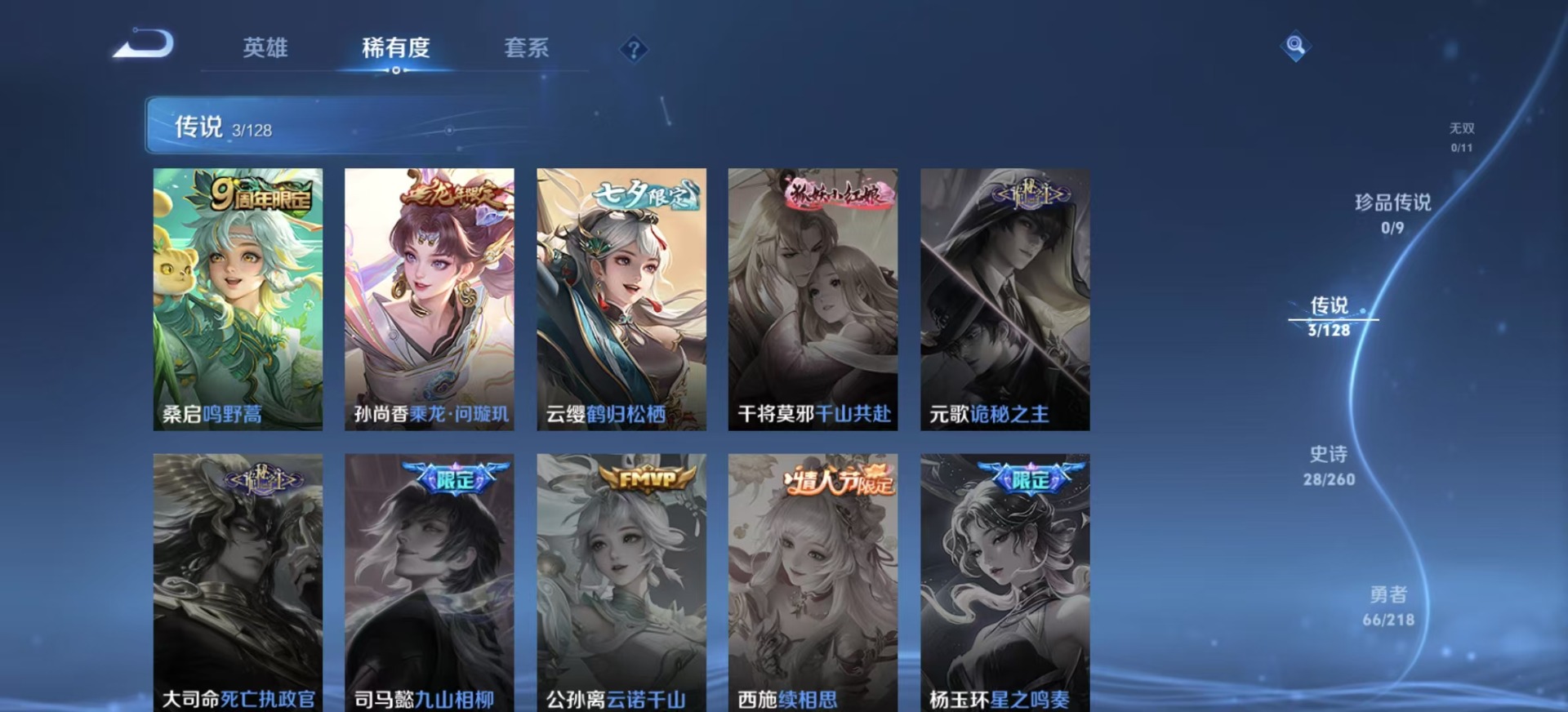 - PX_2095395-99 安卓QQ/至尊星耀/216皮肤/124英雄/2典藏/0珍品无双/0无双/1珍品传说/16传说/74史诗/8稀有英雄 【1 珍品传说】怪盗基德 马可波罗, 【2 典藏皮肤】银白咏叹调 铠,最初的交响 伽罗, 【16 传说皮肤】逐花归海 澜,浮生妄 夏洛特,祈雪灵祝 公孙离,黄金射手座 后羿,久胜战神 干将莫邪,山海·炽霜斩 李信,音你心动 小乔,妄想奇谈 上官婉儿,妄想实