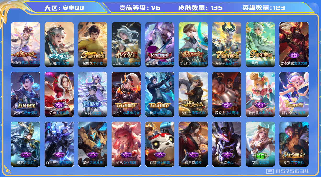 - [11686960]V7 6传说 123英雄 223皮肤 可修改实名 优质装备:久胜战神,云霓雀翎,胖达荣荣,超时空战士-狄仁杰 珍宝阁皮:优雅恋人,蔷薇恋人 限定皮:逐霄战戟,鸣野蒿,山海·碧波行(瑶年限),高山流水,怒海麟威,五谷丰年,逐梦之音,匿光启智者,时之奇旅-妲己,山海·玄木吟(马可年限) 史诗皮:化蝶舞,破空之剑,战舞者,琥珀纪元伽罗,决胜骁骑,蔬乡物语(鲁班七号),百相守梦-百里守约,百相守梦-黄忠,紫霞仙子,黄金分割率,特工魅影,千年之狐,江河有灵,匿光侦查者,雪夜绮愿(周瑜),百解令(蒙犽),高渐离燃音魔法,无限星赏官,偶像歌手,白蛇,电玩·爆裂旋风,暗夜猫娘,龙骑士(小龙虾),末日机甲-吕布,猫狗日记-孙策,猫狗日记-大乔,时之恋人-孙尚香,乱世虎臣,节奏热浪,女仆咖啡,水果甜心,星夜王子,心灵骇客,功夫厨神,暗隐猎兽者,幽灵船长,鬼剑武藏,心灵战警,天秀·启明,舞动绿茵,地狱岩魂,纤云弄巧,拒霜思,缤纷独角兽,乘风破浪,水晶猎龙者,曙光守护者,箭羽风息,金属风暴,圣诞狂欢,鹰眼统帅,暗夜贵公子,魅力维加斯,无心,未来纪元-赵云