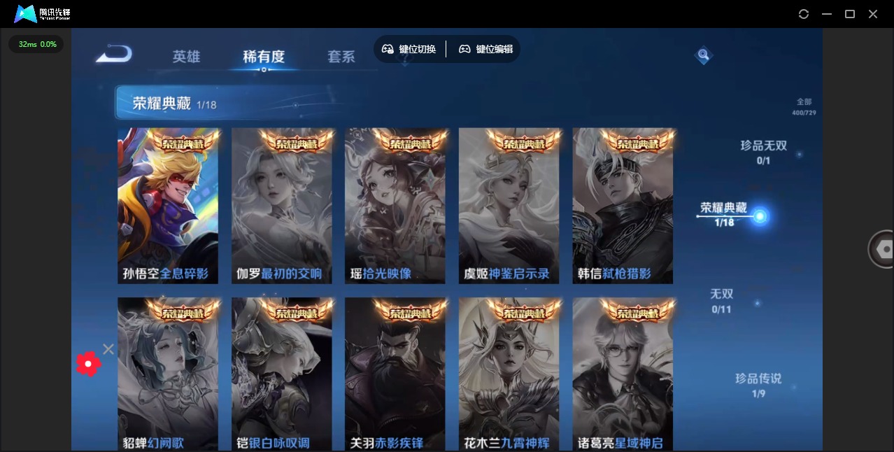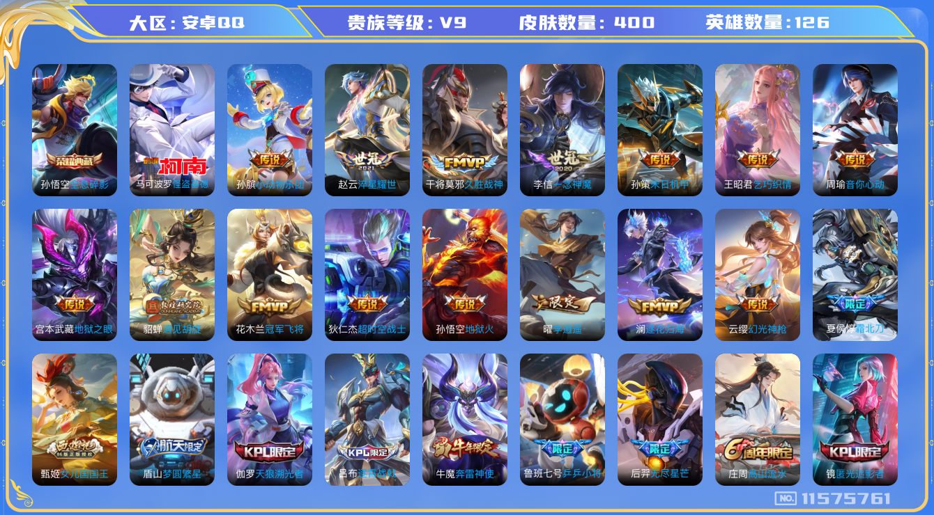 - [11866602]V10 5典藏 3无双 4珍品传说 58传说 125英雄 442皮肤 可修改实名 优质装备:鸣剑·曳影,全息碎影(猴子典藏),九霄神辉(木兰典藏),赤影疾锋,弑枪猎影(韩信典藏),真我赫兹(瑶)(瑶无双),小乔时之魔女(小乔无双),器灵·螭龙剑,江户川柯南,怪盗基德,朽木白哉,黄金狮子座,黄金射手座,云鹰飞将(小将军),绛天战甲(鸡嘴战神),黄金白羊座,猫影幻舞,久胜战神,炽阳神光,一念神魔,云霓雀翎,末日机甲-孙尚香(绿蚂蚱),地狱火,仲夏夜之梦(大飞蛾),音你心动-小乔,零号·赤焰,海洋之心,地狱之眼,飞鸢探春,音你心动-周瑜,胖达荣荣,乞巧织情,时之恋人-刘备(电焊工),游龙清影(小青龙),淬星耀世,超时空战士-狄仁杰,花朝如约(花篮子),无双飞将,音你闪耀(rap皮),碎云,画中仙,浮生妄,记忆之芯(机甲兔),惊梅引,鲁班七号-时之奇旅,霜月吟,澜逐花归海,艾琳觅芳踪,玄雷天君,千劫归真,涂山容容 珍品传说:时之奇旅-孙策 传说皮:典韦战鼓燎原,星之鸣奏,幻光神枪 珍宝阁皮:妄想食味,蔷薇恋人 限定皮:愿照·九州拓(澜年限),愿照·福禄聚(蔡文姬年限),愿照·岁时盈(虞姬年限),愿照·山河定(司空震年限),愿照·众生和(妲己年限),愿照·千秋盛(女娲年限),逐霄战戟,鸣野蒿,至尊宝,白虎志(电光耗子),太华(伽罗年限),傲雪梅枪,绯月行,时之彼端,白鹤梁神女,时雨天司(水龙头),神威(电光马子),遇见飞天,高山流水,诗剑行,怒海麟威,五谷丰年,青龙志(铠年限),冰锋战神,武圣,游园惊梦,梁祝,御风骁将(吕布年限),逐梦之翼,逐梦之音,李小龙,逐梦之影,朱雀志(守约年限),如梦令-后羿,霸王别姬-项羽,霸王别姬-虞姬,默契交锋-花木兰,孙行者,大圣娶亲,青春决赛季,冰霜恋舞曲,蜜橘之夏,深海之息(深海大菠萝),山海·玄木吟(马可年限) 史诗皮:鸭鸭历险记-刘禅,飞车小橘子,器灵·浮梦炉,糖绘人间,瑰影绮梦,化蝶舞,灵蛊蚀心,星界战将,谪仙醉月,龙之律动,石田雨龙,百相守梦-周瑜,茶境仙,怒海争锋,曹操夜都魔契,百相守梦-百里守约,星界特工,百相守梦-黄忠,遇见神鹿,紫霞仙子,苍穹之光,电玩小子(小书包),白龙吟,黄金分割率,特工魅影,千年之狐,江河有灵,匿光侦查者,浮梦罗烟,魅语,无限星赏官,冰冠公主,青蛇,偶像歌手,白蛇,暗夜猫娘,龙骑士(小龙虾),末日
