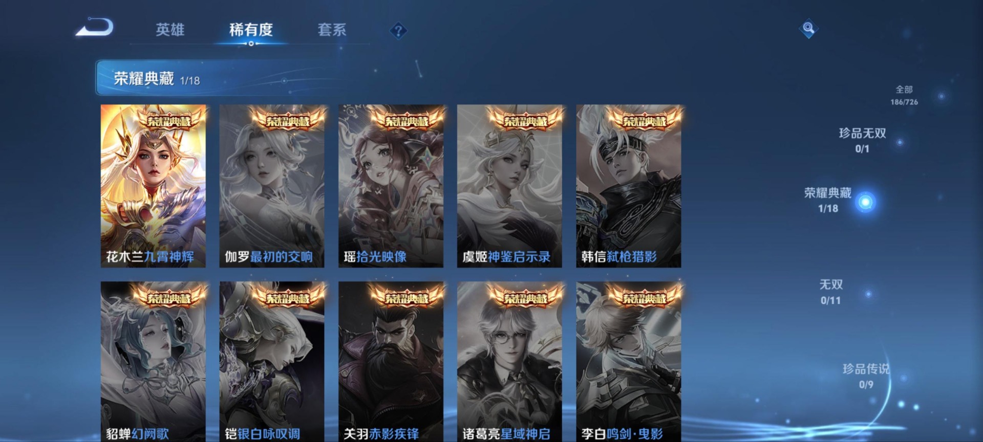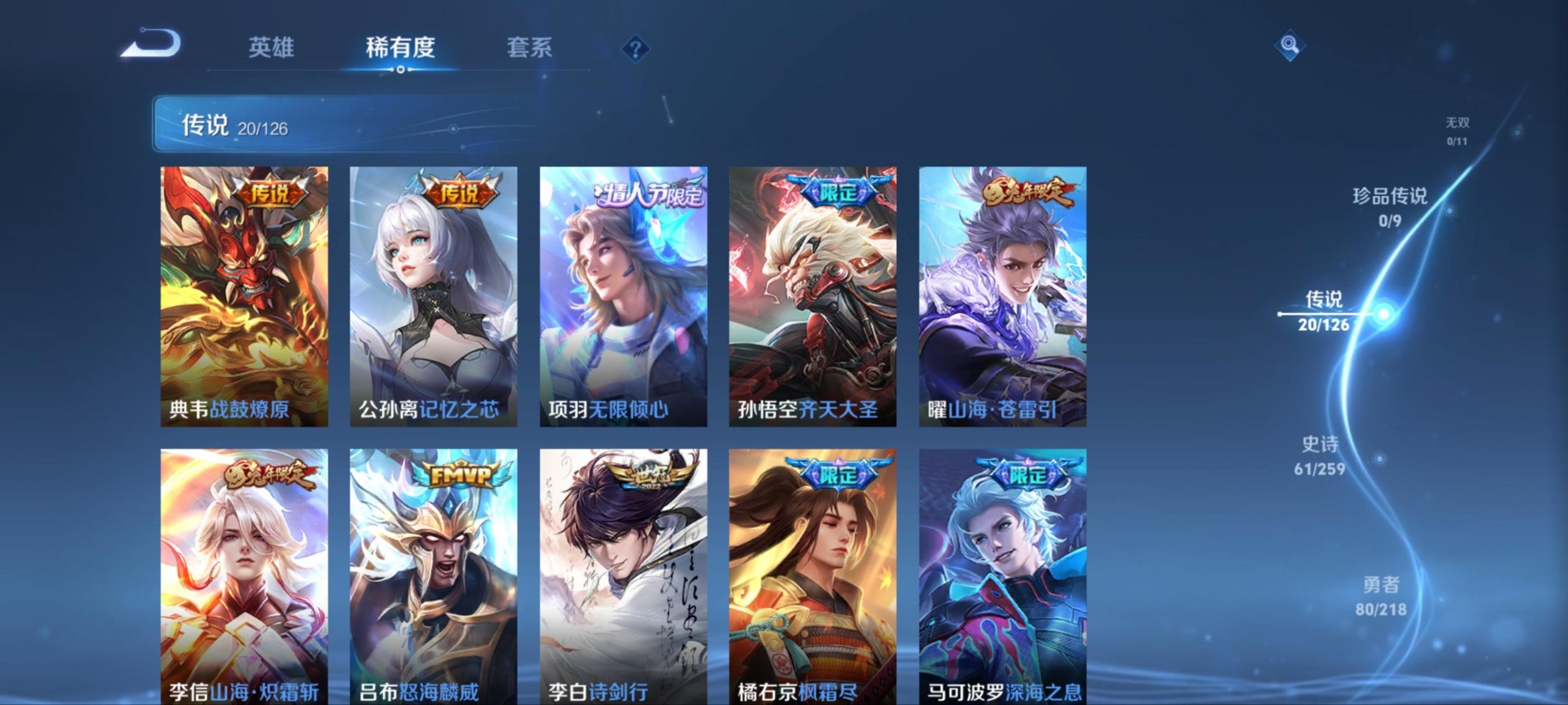 - [12297571]V7 2典藏 3珍品传说 8传说 125英雄 341皮肤 可修改实名 优质装备:鸣剑·曳影,弑枪猎影(韩信典藏),怪盗基德,一念神魔,胖达荣荣,涂山容容 珍品传说:时之奇旅-孙策,兔狲·蓬尾 传说皮:落雪白狼,死亡执政官,幻光神枪 珍宝阁皮:妄想食味,蔷薇恋人 限定皮:愿照·岁时盈(虞姬年限),逐霄战戟,鸣野蒿,白鹤梁神女,遇见飞天,五谷丰年,梁祝,李小龙,永曜之星,圣诞老人,孙行者,百木心枪,玉兔公主,天降福星 史诗皮:鸭鸭历险记-刘禅,器灵·浮梦炉,化蝶舞,星界战将,谪仙醉月,龙之律动,雪豹·霜爪,石田雨龙,百相守梦-周瑜,茶境仙,破空之剑,战舞者,东方月初,蒙犽顽岩魄,琥珀纪元伽罗,蔬乡物语(鲁班七号),百相守梦-百里守约,百相守梦-黄忠,织梦人,紫霞仙子,特工魅影,江河有灵,雪夜绮愿(周瑜),魅语,百解令(蒙犽),高渐离燃音魔法,蒙恬荣光圣徽,偶像歌手,白蛇,电玩·爆裂旋风,末日机甲-吕布,猫狗日记-孙策,乱世虎臣,节奏热浪,女仆咖啡,摇滚巨星,水果甜心,天才门将,星夜王子,心灵骇客,功夫厨神,德古拉伯爵,暗隐猎兽者,幽灵船长,鬼剑武藏,心灵战警,乐园奇幻夜,舞动绿茵,地狱岩魂,纤云弄巧,拒霜思,缤纷独角兽,乘风破浪,逐浪之夏,水晶猎龙者,曙光守护者,金属风暴,原初追逐者,圣诞狂欢,圣诞恋歌,鹰眼统帅,王者之锤,魅力维加斯,未来纪元-赵云
