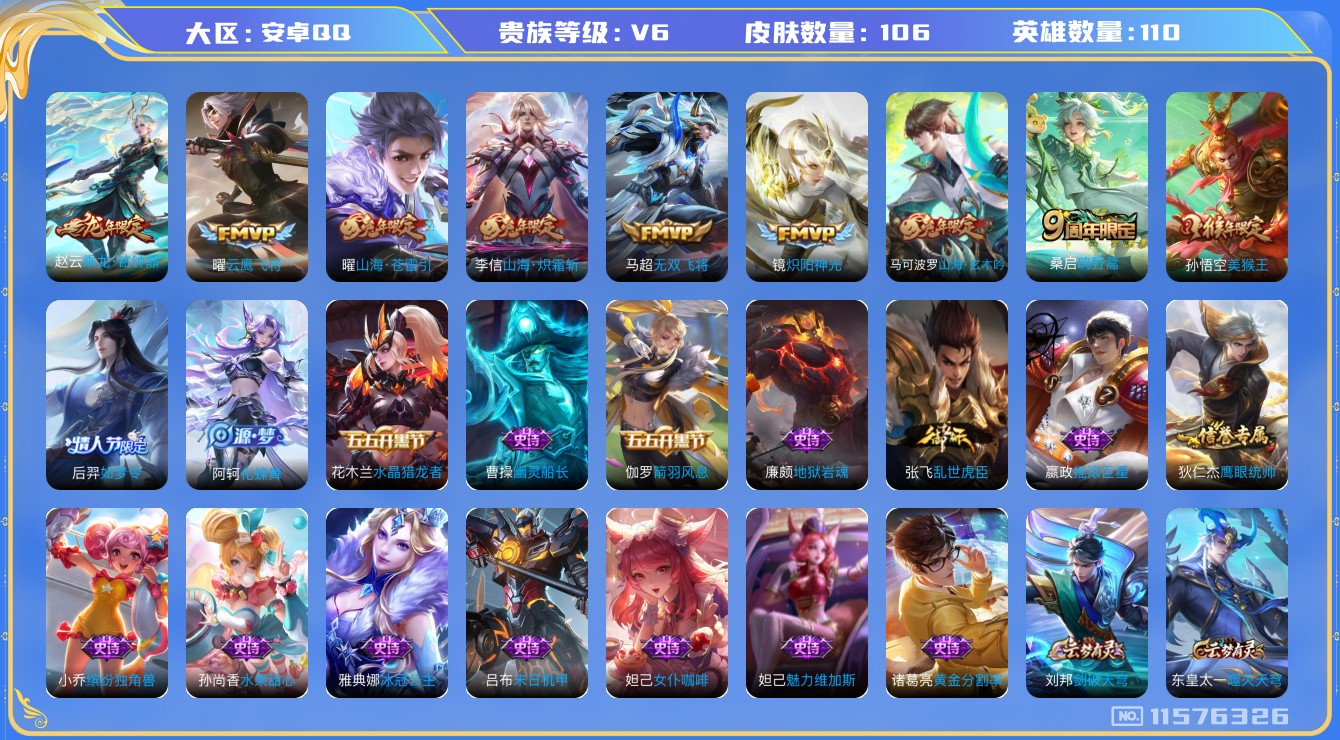 [11576326]V6 7传说 110英雄 106皮肤 可修改实名 优质装备:云鹰飞将(小将军),炽阳神光,无双飞将,山海·炽霜斩(李信年限),山海·苍雷引(电光曜子) 传说皮:乘龙·铭钟鼎(赵云年限) 限定皮:鸣野蒿,如梦令-后羿,美猴王,山海·玄木吟(马可年限) 史诗皮:化蝶舞,黄金分割率,冰冠公主,末日机甲-吕布,乱世虎臣,女仆咖啡,摇滚巨星,水果甜心,幽灵船长,地狱岩魂,缤纷独角兽,水晶猎龙者,箭羽风息,鹰眼统帅,魅力维加斯