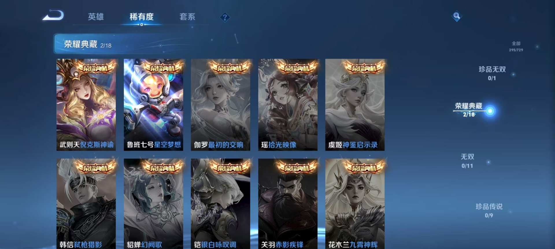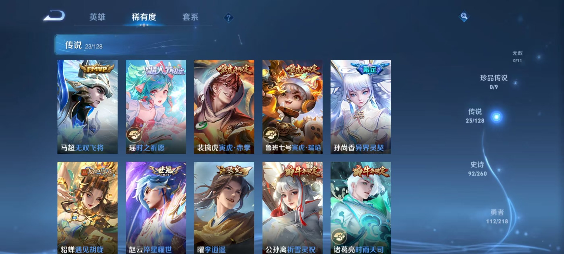 大乔白鹤梁神女,哪吒逐梦之翼,廉颇寅虎·御盾,伽罗天狼溯光者,伽罗太华,孙膑天狼运算者,孙膑寅虎·展翼,典韦岱宗,孙尚香异界灵契,牛魔奔雷神使,鲁班七号乒乒小将,鲁班七号寅虎·瑞焰,吕布御风骁将,露娜一生所爱,诸葛亮时雨天司,杨玉环寅虎·心曲,公孙离祈雪灵祝,裴擒虎梅西,鲁班大师匿光启智者,裴擒虎李小龙,裴擒虎天狼狩猎者,裴擒虎寅虎·赤拳,上官婉儿梁祝,上官婉儿天狼绘梦者,花木兰瑞麟志,猪八戒猪悟能,孙悟空孙行者,芈月白晶晶,马超神威,云中君时之祈愿,韩信逐梦之影,瑶时之祈愿,虞姬霸王别姬,关羽冰锋战神