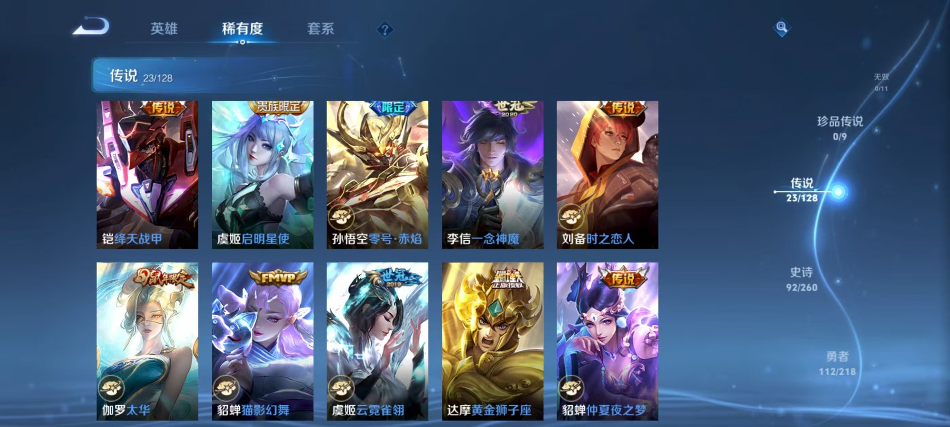 - [12265773]V7 1典藏 1珍品传说 3传说 109英雄 99皮肤 可修改实名 优质装备:赤影疾锋,朽木白哉,涂山容容 传说皮:死亡执政官 限定皮:愿照·山河定(司空震年限),鸣野蒿,至尊宝,至美·乘鲤谣 史诗皮:飞车小橘子,器灵·浮梦炉,化蝶舞,龙之律动,百相守梦-周瑜,茶境仙,百相守梦-黄忠,星界特工,撼地雄心,破空之剑,百相守梦-百里守约,光弋星穹,紫霞仙子,千年之狐,冰冠公主,偶像歌手,龙骑士(小龙虾),暗夜猫娘,节奏热浪,摇滚巨星,绅士熊喵,星夜王子,功夫厨神,德古拉伯爵,幽灵船长,鬼剑武藏,暗渊魔法,地狱岩魂,乘风破浪,逐浪之夏,曙光守护者,鹰眼统帅,魅力维加斯,黎明之约,雪上飞焰