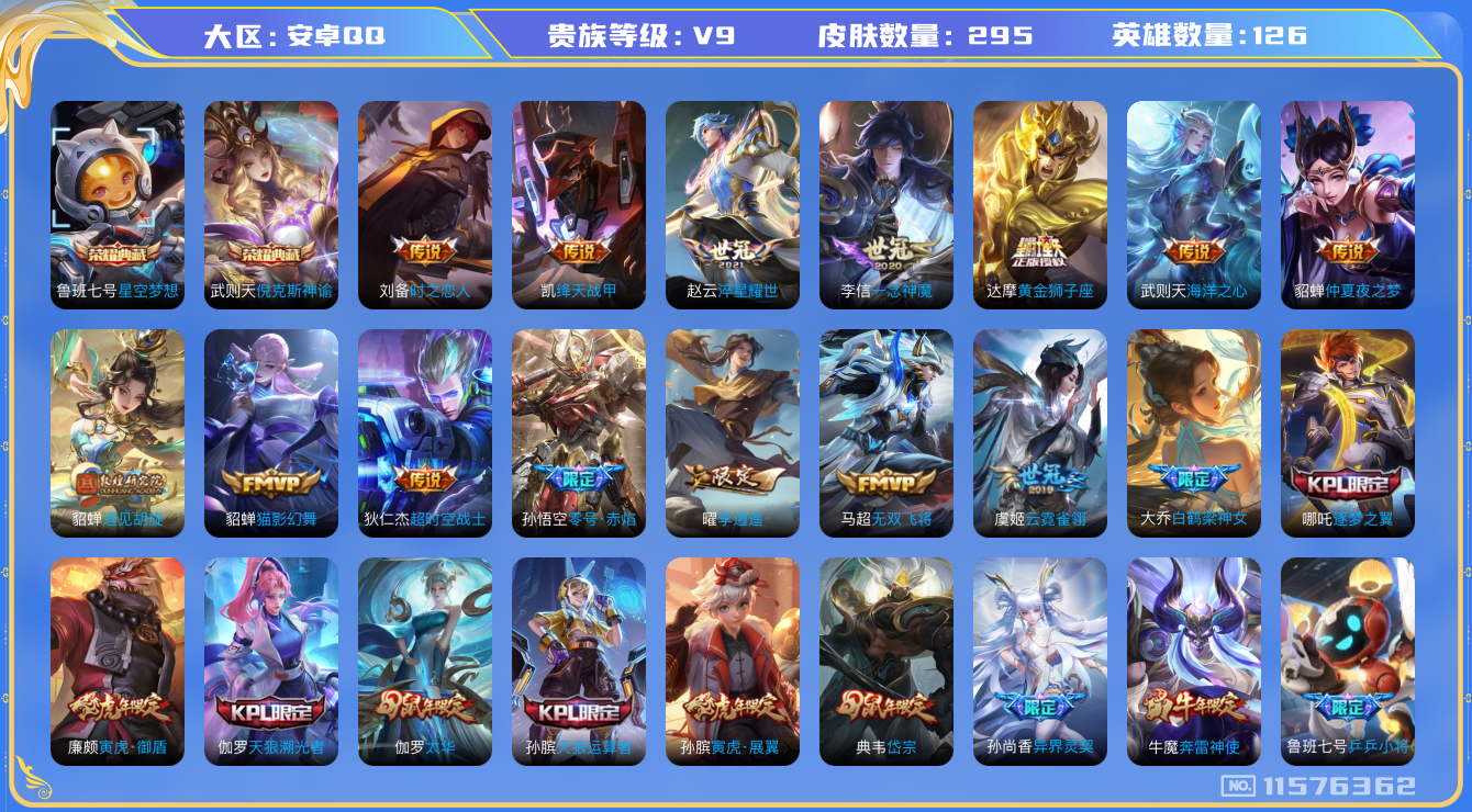[11576362]V9 2典藏 23传说 126英雄 295皮肤 典藏英雄武则天 女号 可修改实名 优质装备:星空梦想(太空人),倪克斯神谕(宇宙婆娘),黄金狮子座,绛天战甲(鸡嘴战神),猫影幻舞,一念神魔,云霓雀翎,仲夏夜之梦(大飞蛾),零号·赤焰,海洋之心,李逍遥,时之恋人-刘备(电焊工),淬星耀世,超时空战士-狄仁杰,遇见胡旋,无双飞将 珍宝阁皮:优雅恋人,蔷薇恋人 限定皮:凤求凰(白切鸡),太华(伽罗年限),梅西,异界灵契(白毛香),寅虎·展翼(孙膑年限),白鹤梁神女,白晶晶,时雨天司(水龙头),神威(电光马子),瑞麟志(木兰年限),遇见飞天,高山流水,冰锋战神,天狼运算者,梁祝,御风骁将(吕布年限),天狼狩猎者,逐梦之翼,岱宗(典韦年限),天狼溯光者,奔雷神使(牛魔年限),祈雪灵祝(雪兔子),天狼绘梦者,李小龙,逐梦之影,霸王别姬-虞姬,孙行者,猪悟能,一生所爱,乒乒小将,寅虎·御盾(廉颇年限),寅虎·瑞焰(虎皮蛋子),寅虎·心曲(虎婆),寅虎·赤拳(老虎年限),时之祈愿-云中君,时之祈愿-瑶(瑶传限),匿光启智者 史诗皮:紫霞仙子,苍穹之光,电玩小子(小书包),白龙吟,黄金分割率,特工魅影,千年之狐,冰冠公主,青蛇,偶像歌手,白蛇,晚萤,暗夜猫娘,末日机甲-吕布,猫狗日记-孙策,猫狗日记-大乔,女仆咖啡,水果甜心,天才门将,星夜王子,心灵骇客,功夫厨神,德古拉伯爵,幽灵船长,心灵战警,舞动绿茵,地狱岩魂,诗语江南,纤云弄巧,繁星吟游(呼啦呼啦),缤纷独角兽,逐浪之夏,龙鼓争鸣,箭羽风息,金属风暴,原初追逐者,圣诞恋歌,鹰眼统帅,王者之锤,魅力维加斯,黎明之约,雪上飞焰,赏金猎手,寅虎·御盾,千筹问战,无心