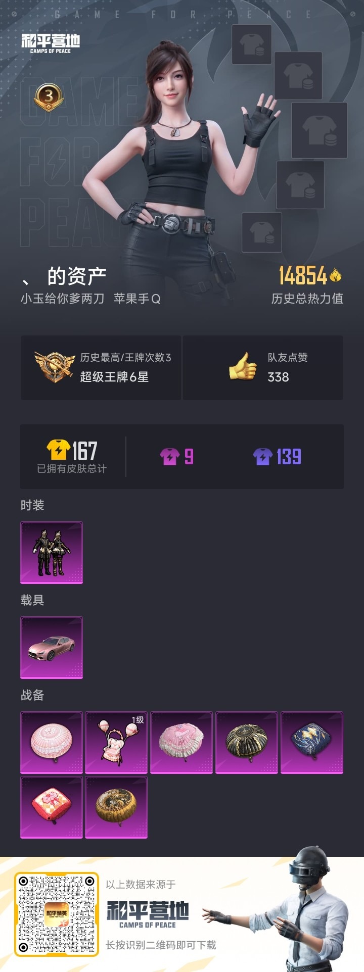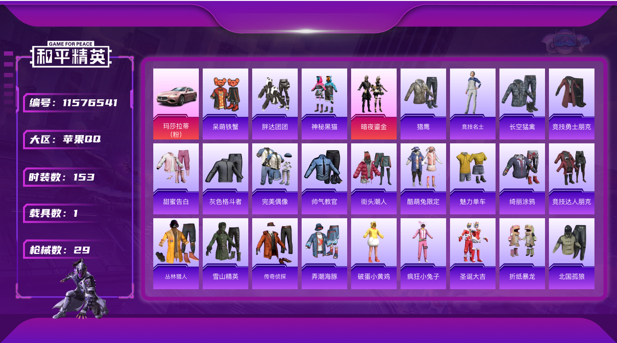 [11576541]1粉装 1载具 3印记 可二次 可修改实名 优质装备:玛莎拉蒂Ghibli(粉) 热门装扮:暗夜鎏金,神秘黑猫,胖达团团,呆萌铁蟹 紫色装扮:轻风白浪,白啸长虹,绚烂繁星,熠彩粉晶,北国孤狼,酷萌兔限定,长空猛禽,雪山精英,街头潮人,魅力单车,深蓝色名流,圣诞大吉,完美偶像,帅气教官,绮丽涂鸦,疯狂小兔子,破蛋小黄鸡,甜蜜告白,竞技勇士朋克,竞技达人朋克,灰色格斗者,猎鹰,竞技名士,春野茶蘼,惊鸿侠骨,元气发射,锦衣飞扬,SS7特训,淡雅花蕊,折纸暴龙,云纹魔法士,智慧之神,SS9特训,绯格组合,弄潮海豚,丛林猎人,传奇侦探 优质战备:青空秋雨降落伞,妙趣可丽降落伞,粉樱探戈飞行器,粉樱探戈降落伞,暗夜鎏金降落伞,至尊龙雀降落伞,甜蜜誓约降落伞