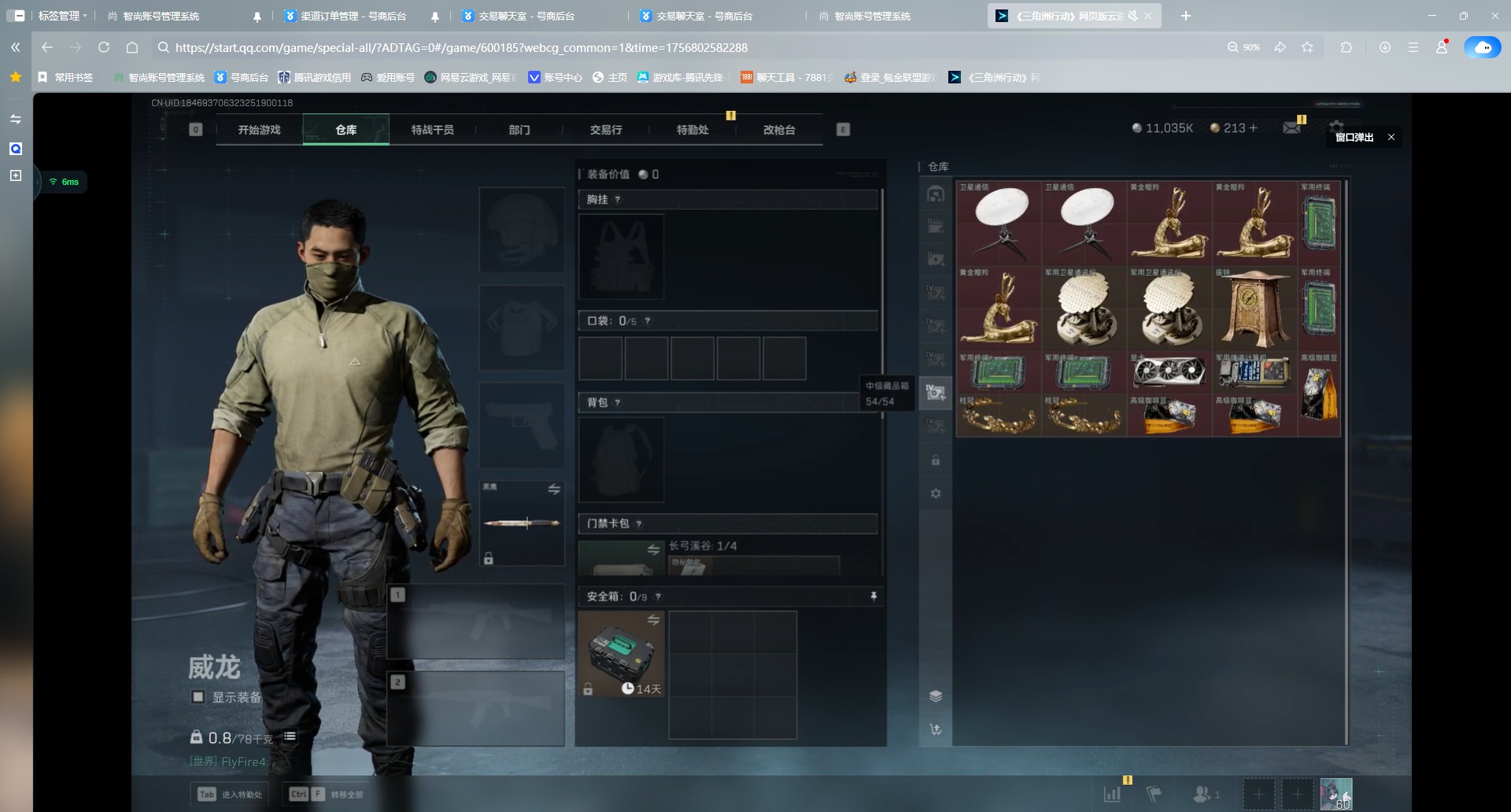 - [11432008]总资产:184.3M 5干员外观 1近战传说 18传说枪械 哈夫币:11.581K 顶级安全箱(3×3)9.15号到期 可二次 可修改实名 优质装备:近战-黑海,K416突击步枪-命运(典藏),顶级安全箱(3x3) 烽火地带段位:钻石 全面战场段位:上等兵 传说武器皮肤:SCAR-H战斗步枪-铁艺苍穹,AK-12突击步枪-夜鹰,SMG45冲锋枪-骑士,CAR-15突击步枪-阿米娅,复合弓-黑-天际线,AK-12突击步枪-特斯拉线圈,SR-3M紧凑突击步枪-特斯拉线圈,UZI冲锋枪-特斯拉线圈,勇士冲锋枪-能天使-午夜邮差,725双管霰弹枪-送葬人-无题密令,S12K霰弹枪-幻想曲,MP5冲锋枪-黑海,G3战斗步枪-幻想曲,K416突击步枪-幻想曲,QJB201轻机枪-黑海,M4A1突击步枪-蚀金玫瑰 史诗武器皮肤:K416突击步枪-潜袭者,QBZ95-1突击步枪-ACE,M4A1突击步枪-特勤执行,M700狙击步枪-蝮蛇,PKM通用机枪-蝮蛇,SR-25射手步枪-尖端治疗,PKM通用机枪-荒野求生,AS Val突击步枪-尖端治疗,SG552突击步枪-尖端治疗,Ash-12战斗步枪-守夜人,MP5冲锋枪-深海恐惧,SR-3M紧凑突击步枪-荒野求生,SG552突击步枪-深海恐惧,AKM突击步枪-林中猎手,M16A4突击步枪-竞赛选手,PKM通用机枪-守夜人,SVD狙击步枪-荒野求生,SV-98狙击步枪-林中猎手,PTR-32突击步枪-英雄,PSG-1射手步枪-无垢,AS Val突击步枪-典狱官,M250通用机枪-囚徒,SV-98狙击步枪-囚徒,腾龙突击步枪-无垢,MP7冲锋枪-无垢,QBZ95-1突击步枪-曙光,SCAR-H战斗步枪-危险实验,Vector冲锋枪-阿萨拉文明,SVD狙击步枪-阿萨拉工艺,S12K霰弹枪-曙光 干员外观:红狼-蚀金玫瑰,威龙-壮志凌云,无名-夜鹰,蜂医-送葬人·无题密令(S5),露娜-黑·天际线