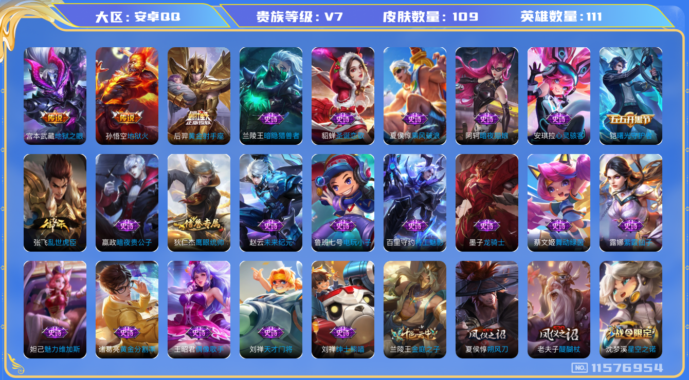 - [11554054]V7 4传说 124英雄 214皮肤 可修改实名 优质装备:零号·赤焰,超时空战士-狄仁杰 珍宝阁皮:妄想食味,蔷薇恋人 限定皮:至尊宝,时雨天司(水龙头),飞衡(韩信年限),高山流水,诗剑行,五谷丰年,冰锋战神,游园惊梦,梁祝,李小龙,逐梦之影,朱雀志(守约年限),孙行者,大圣娶亲,山海·玄木吟(马可年限) 史诗皮:鸭鸭历险记-刘禅,苍穹之光,白龙吟,黄金分割率,特工魅影,千年之狐,江河有灵,暗夜猫娘,魅语,无限星赏官,末日机甲-吕布,乱世虎臣,水果甜心,天才门将,星夜王子,心灵骇客,功夫厨神,德古拉伯爵,暗隐猎兽者,幽灵船长,鬼剑武藏,暗渊魔法,心灵战警,舞动绿茵,繁星吟游(呼啦呼啦),拒霜思,缤纷独角兽,乘风破浪,逐浪之夏,水晶猎龙者,曙光守护者,金属风暴,原初追逐者,圣诞狂欢,圣诞恋歌,鹰眼统帅,魅力维加斯,黎明之约,赏金猎手,天秀·音浪,无心,未来纪元-赵云