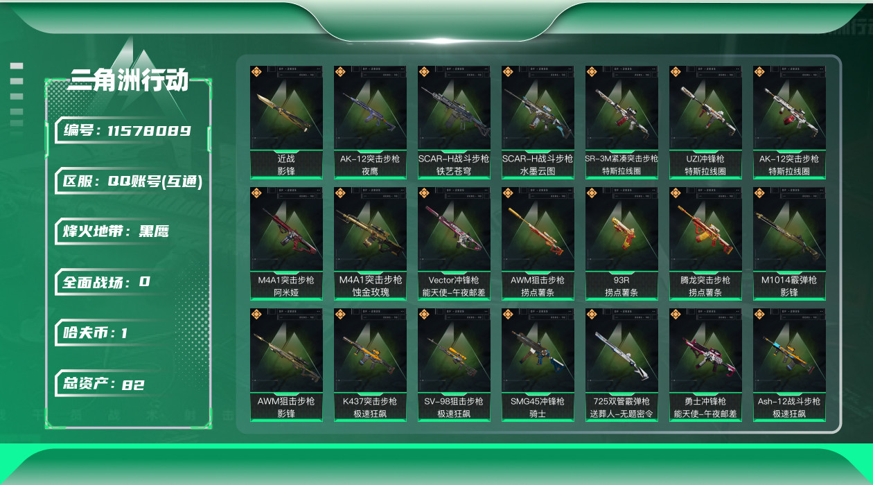 [11578089]总资产:82.5M 1干员外观 1近战传说 25传说枪械 哈夫币:1.338K 顶级安全箱(3×3)9.15号到期 可二次 可修改实名 优质装备:近战-影锋,顶级安全箱(3x3) 烽火地带段位:黑鹰 全面战场段位:将军 传说武器皮肤:SCAR-H战斗步枪-水墨云图,M1014霰弹枪-影锋,AWM狙击步枪-影锋,SCAR-H战斗步枪-铁艺苍穹,SV-98狙击步枪-极速狂飙,Ash-12战斗步枪-极速狂飙,K437突击步枪-极速狂飙,SMG45冲锋枪-骑士,G18-飞虎,UZI冲锋枪-特斯拉线圈,AWM狙击步枪-捞点薯条,腾龙突击步枪-捞点薯条,93R-捞点薯条,AK-12突击步枪-特斯拉线圈,SR-3M紧凑突击步枪-特斯拉线圈,勇士冲锋枪-能天使-午夜邮差,Vector冲锋枪-能天使-午夜邮差,复合弓-黑-天际线,725双管霰弹枪-送葬人-无题密令,M4A1突击步枪-阿米娅,CAR-15突击步枪-阿米娅,AK-12突击步枪-夜鹰,M4A1突击步枪-蚀金玫瑰,CAR-15突击步枪-黑鹰坠落 史诗武器皮肤:Vector冲锋枪-潜袭者,K416突击步枪-暗鸦,M1014霰弹枪-暗鸦,P90冲锋枪-暗鸦,K416突击步枪-潜袭者,M1014霰弹枪-潜袭者,AK-12突击步枪-原型机(典藏),QBZ95-1突击步枪-ACE,AUG突击步枪-特勤执行,M4A1突击步枪-特勤执行,Vector冲锋枪-红色彗星,PTR-32战斗步枪-ACE,SKS射手步枪-ACE,AUG突击步枪-蝮蛇,M700狙击步枪-蝮蛇,PKM通用机枪-蝮蛇,SR-25射手步枪-战场英杰,Ash-12战斗步枪-守夜人,M16A4突击步枪-竞赛选手,P90冲锋枪-暗影猎手,PKM通用机枪-守夜人,AS Val突击步枪-尖端治疗,M700狙击步枪-守夜人,SG552突击步枪-尖端治疗,SR-25射手步枪-尖端治疗,M1014霰弹枪-林中猎手,MP5冲锋枪-深海恐惧,勇士冲锋枪-深海恐惧,SG552突击步枪-深海恐惧,AKM突击步枪-林中猎手,.357左轮-幸运时刻,QJB201轻机枪-Old Habits,QCQ171冲锋枪-禁卫,SR-3M紧凑突击步枪-纷争,SV-98狙击步枪-林中猎手,PTR-32突击步枪-英雄,AS Val突击步枪-典狱官,PKM通用机枪-荒野求生,M250通用机枪-囚徒