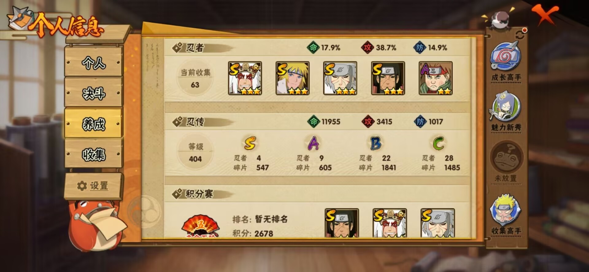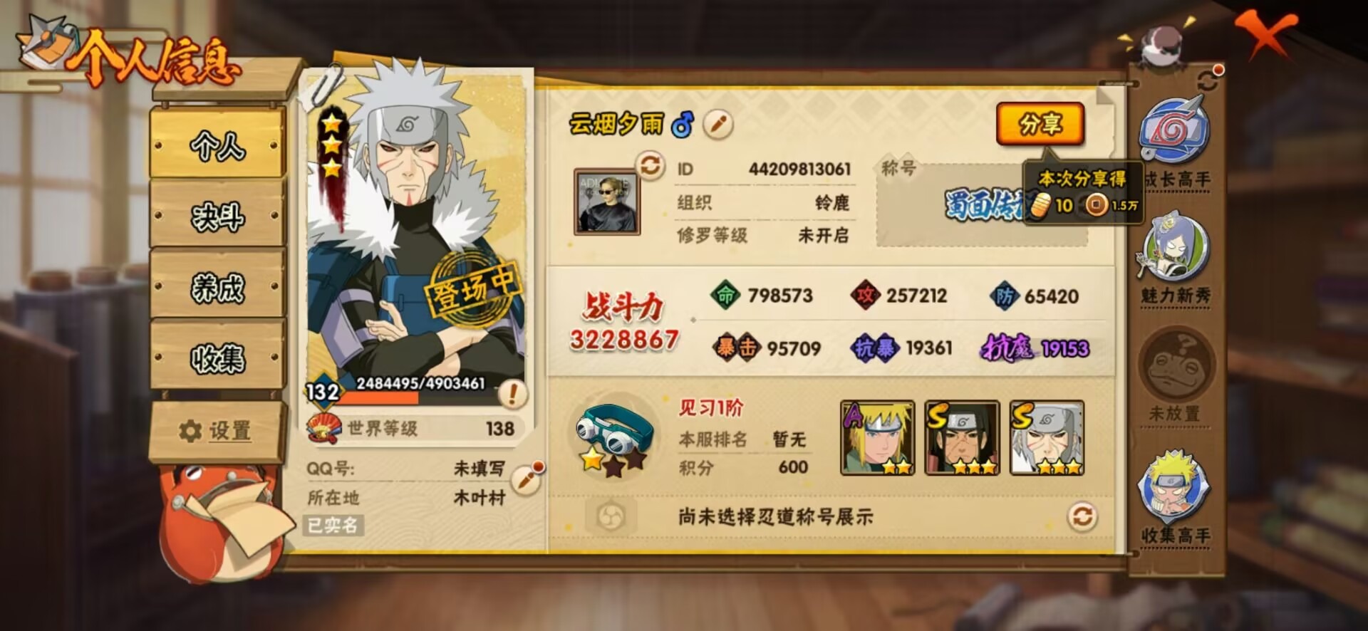 [11578163]V6 4S忍 9A忍 12通灵 322.8W战力 可二次 可修改实名 优质装备:千手柱间「秽土转生」,千手扉间「秽土转生」 S级忍者:自来也 「舞之豪杰」,波风水门