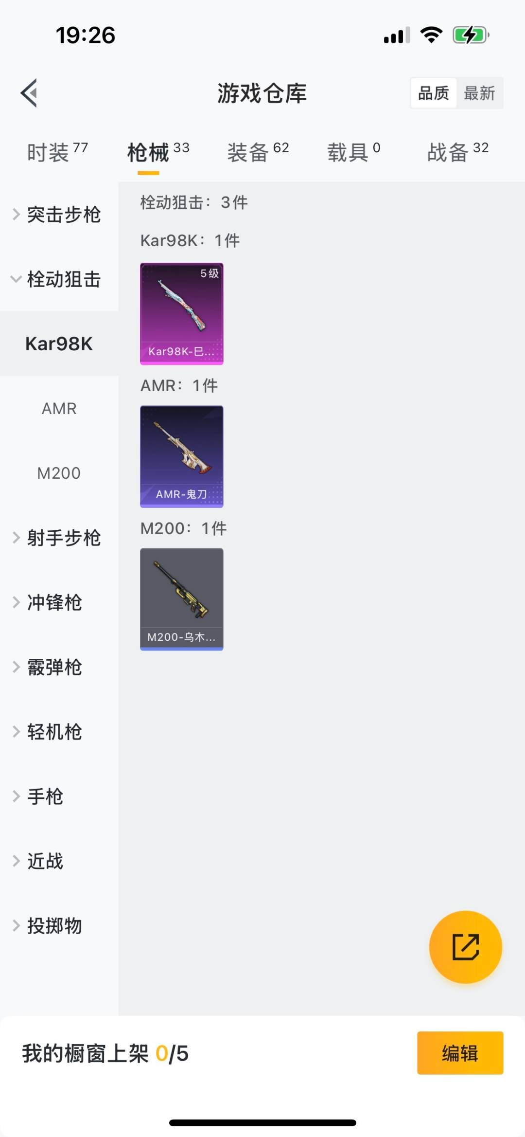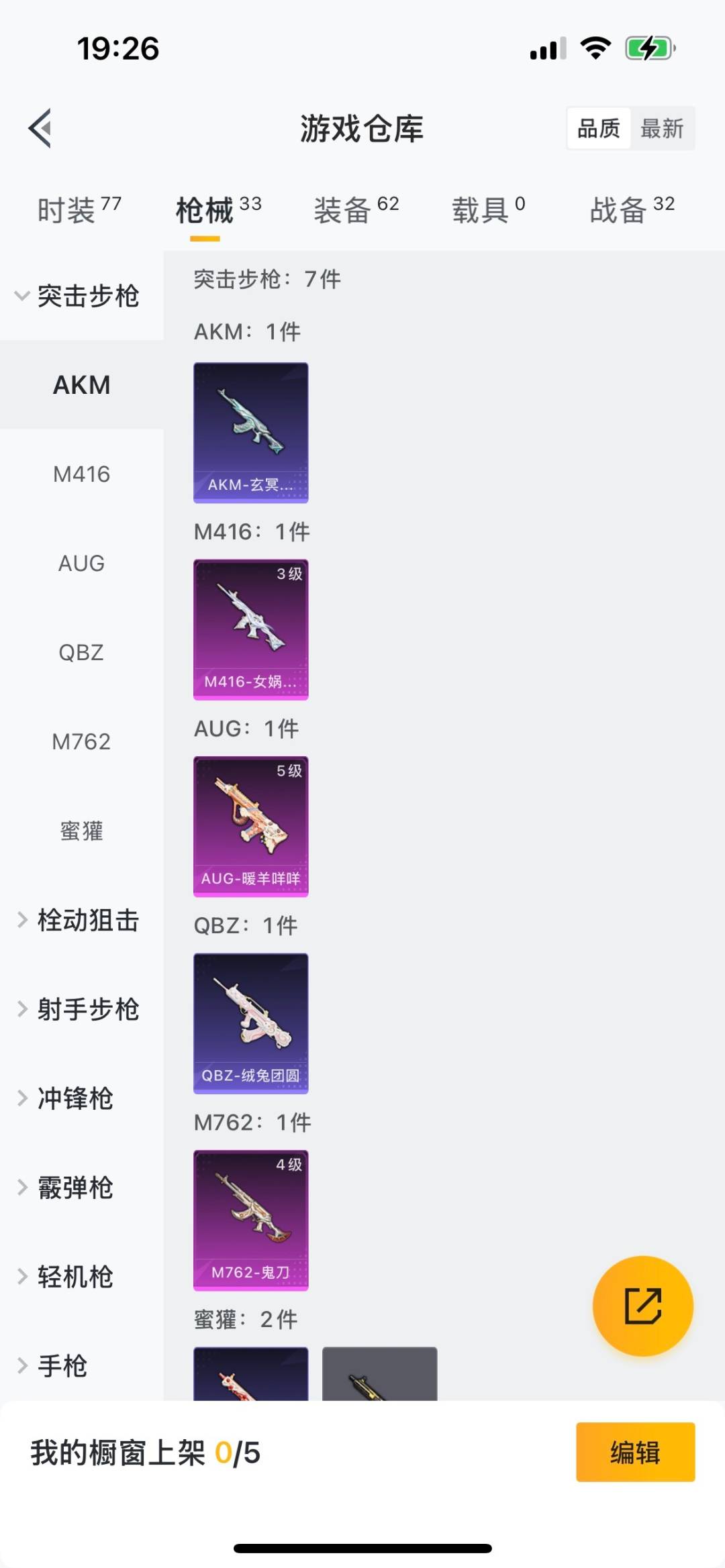 M416-女娲灵识,AUG-暖羊咩咩,M762-鬼刀,Kar98K-巳巳如意
