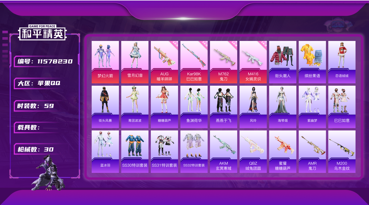 - PX_2102920- 苹果手Q-10王牌印记-8粉装-5特效枪-0载具-68146热力值-152套装-197枪皮-0卓越印记-0传奇印记 【8粉装】,梦幻火箭,甜心巧克力,宝贝奶油派,天使彩虹糖,酣梦娃娃,王牌四分卫,迷蝶贵族,炙焰红王 【5特效枪】AKM-甜心宝贝-5级 M416-心之恋语-7级 M762-甜心娃娃-6级 Kar98K-巳巳如意-1级 Kar98K-伏魔团-4级 【9稀有紫装