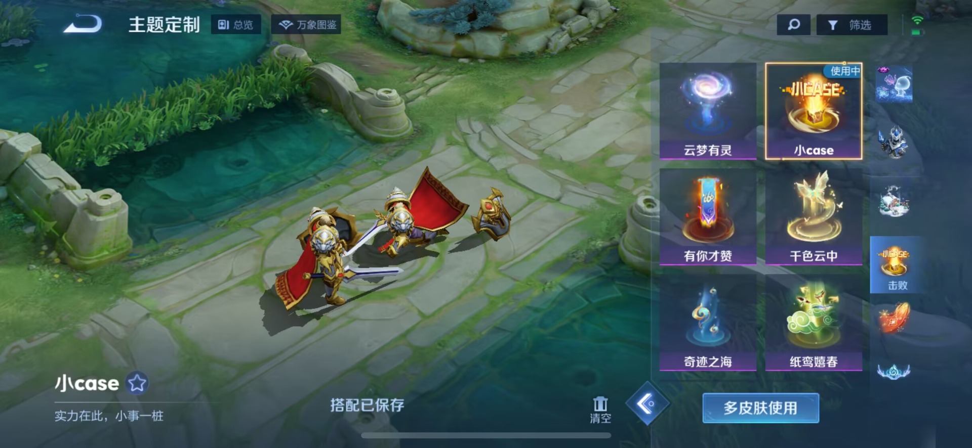 夏侯惇乘风破浪,阿轲节奏热浪,伽罗箭羽风息,廉颇地狱岩魂,孙尚香时之恋人,鲁班七号电玩小子,吕布末日机甲,刘禅绅士熊喵,宫本武藏鬼剑武藏,兰陵王暗隐猎兽者,貂蝉圣诞恋歌,花木兰水晶猎龙者,安琪拉心灵骇客,蒙犽百解令,白起星夜王子,嬴政摇滚巨星,百里玄策热力回旋,百里玄策原初追逐者,雅典娜黎明之约,李元芳逐浪之夏,百里守约特工魅影,墨子金属风暴,橘右京修罗