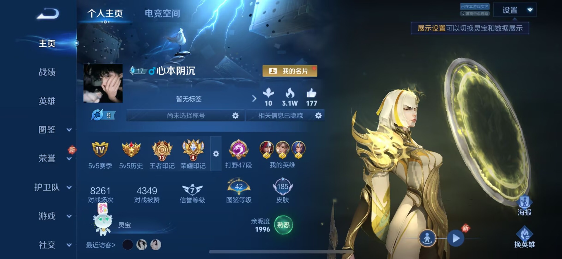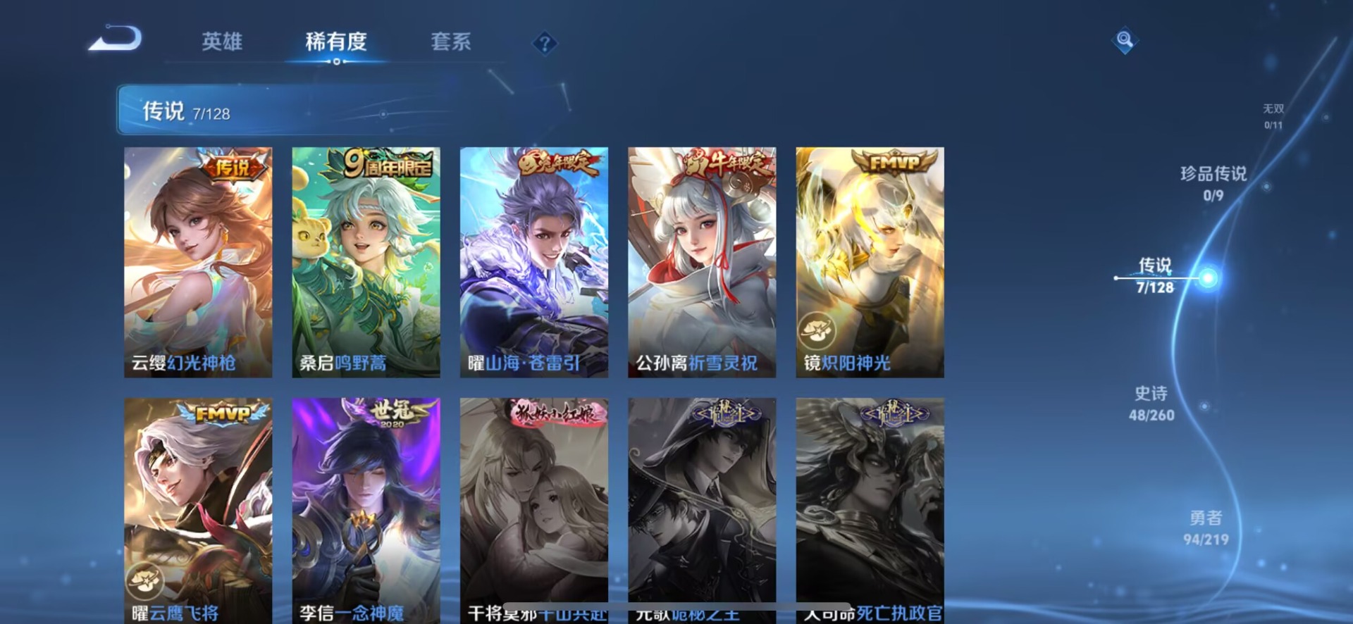 - PX_2106238-贵族等级: V10 英雄数: 126 皮肤数: 421 荣耀水晶: 武则天,天鹅之梦,鸣剑·曳影,星域神启,幻阙歌,弑枪猎影,拾光映像 星传说: 幻海之心,幽冥之眼,金色仲夏夜 传说皮: 黄金射手座,冠军飞将,云鹰飞将,绛天战甲,猫影幻舞,久胜战神,炽阳神光,一念神魔,仲夏夜之梦,海洋之心,地狱之眼,胖达荣荣,时之恋人-刘备,游龙清影,淬星耀世,超时空战士-狄仁杰,无双飞将,
