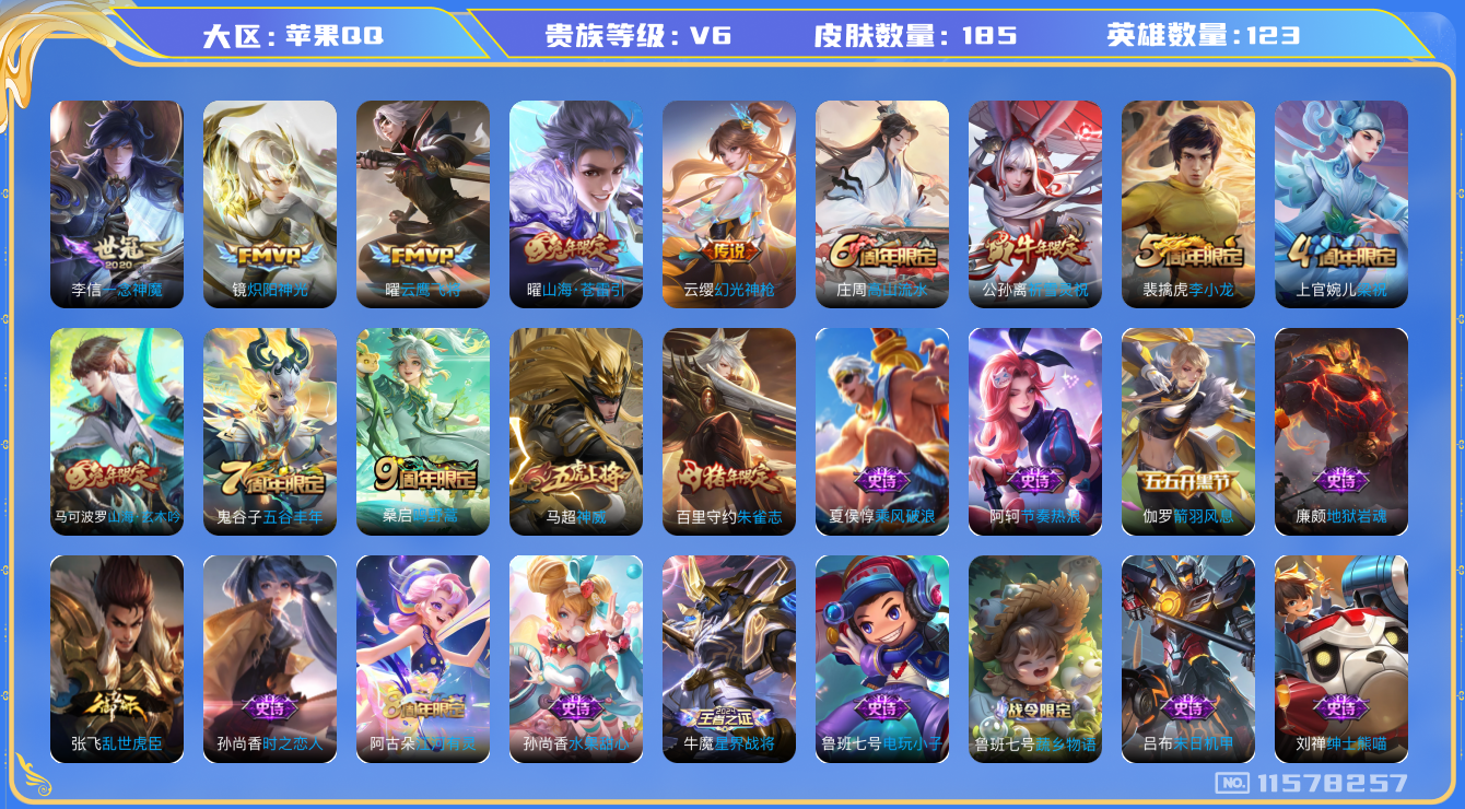 [11578257]V6 7传说 123英雄 185皮肤 可修改实名 优质装备:云鹰飞将(小将军),炽阳神光,一念神魔,山海·苍雷引(电光曜子) 传说皮:幻光神枪 珍宝阁皮:胡桃夹子,万物之道,蔷薇恋人 限定皮:鸣野蒿,神威(电光马子),高山流水,五谷丰年,梁祝,祈雪灵祝(雪兔子),李小龙,朱雀志(守约年限),山海·玄木吟(马可年限) 史诗皮:星界战将,蔬乡物语(鲁班七号),电玩小子(小书包),特工魅影,江河有灵,百解令(蒙犽),蒙恬荣光圣徽,末日机甲-吕布,时之恋人-孙尚香,乱世虎臣,节奏热浪,修罗,女仆咖啡,摇滚巨星,水果甜心,绅士熊喵,星夜王子,心灵骇客,暗隐猎兽者,鬼剑武藏,地狱岩魂,乘风破浪,逐浪之夏,水晶猎龙者,热力回旋,箭羽风息,金属风暴,原初追逐者,圣诞恋歌,鹰眼统帅,魅力维加斯,黎明之约