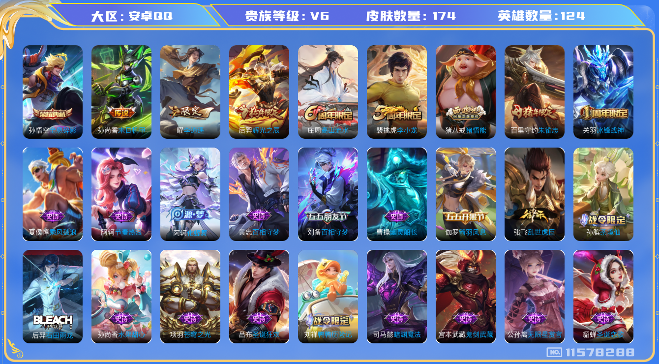 - [11873045]V7 1典藏 5传说 123英雄 218皮肤 可修改实名 优质装备:九霄神辉(木兰典藏),云鹰飞将(小将军),山海·炽霜斩(李信年限),琥珀纪元马超 珍宝阁皮:胡桃夹子,蔷薇恋人 限定皮:鸣野蒿,傲雪梅枪,时雨天司(水龙头),飞衡(韩信年限),五谷丰年,游园惊梦,天狼绘梦者,李小龙,如梦令-后羿,大圣娶亲 史诗皮:星界战将,紫霞仙子,特工魅影,千年之狐,江河有灵,百解令(蒙犽),高渐离燃音魔法,蒙恬荣光圣徽,冰冠公主,偶像歌手,龙骑士(小龙虾),末日机甲-吕布,乱世虎臣,节奏热浪,修罗,摇滚巨星,水果甜心,星夜王子,心灵骇客,功夫厨神,暗隐猎兽者,幽灵船长,鬼剑武藏,心灵战警,地狱岩魂,纤云弄巧,缤纷独角兽,乘风破浪,逐浪之夏,水晶猎龙者,曙光守护者,金属风暴,原初追逐者,圣诞恋歌,鹰眼统帅,魅力维加斯,黎明之约,无心,未来纪元-赵云