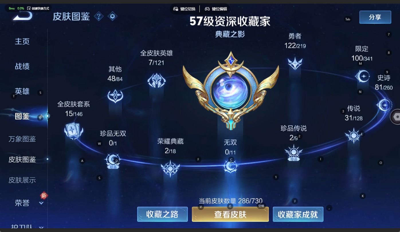 - PX_2086338-实名:,可修改,贵族等级:,V8,英雄数:,123,皮肤数:,361,荣耀水晶:,鸣剑·曳影,珍品传说:,怪盗基德,星传说:,幽冥火,传说皮:,云鹰飞将,炽阳神光,一念神魔,地狱火,时之恋人-刘备,超时空战士-狄仁杰,无双飞将,山海·炽霜斩,妄想实况,澜逐花归海,乘龙·铭钟鼎,吕布曦玄引,限定皮:,冰锋战神,遇见飞天,李小龙,梁祝,白晶晶,时之彼端,飞衡,青春决赛季,美猴王,