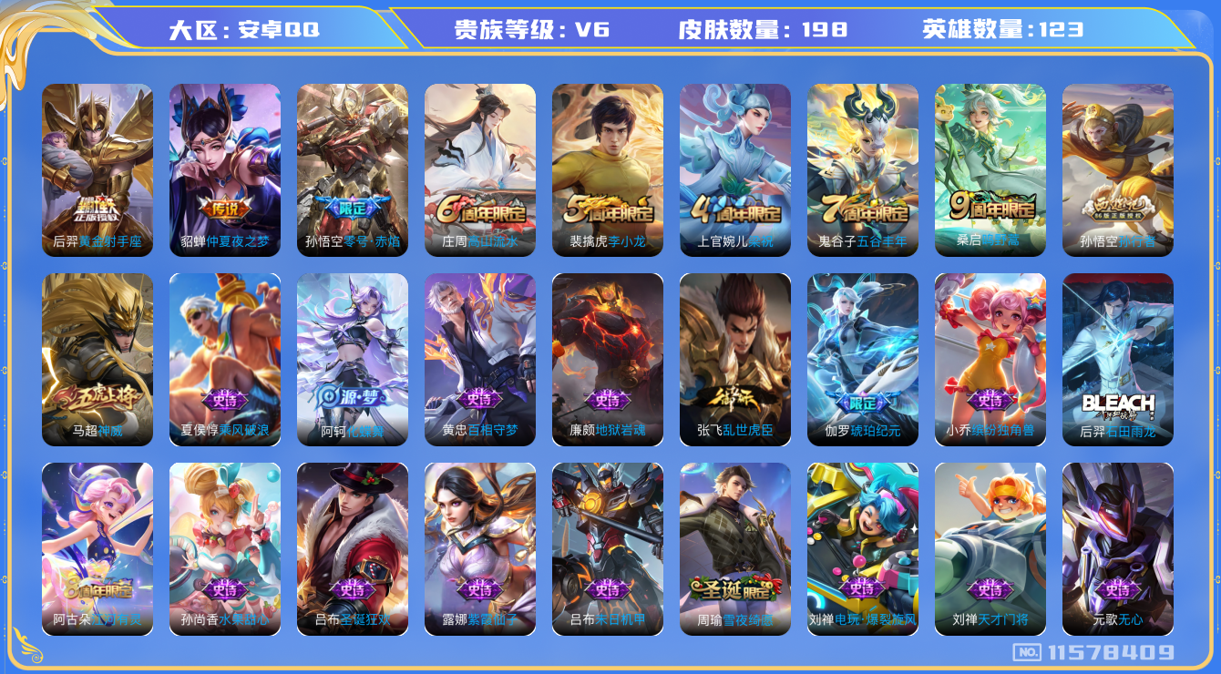 [11578409]V6 4传说 123英雄 198皮肤 可修改实名 优质装备:黄金射手座,仲夏夜之梦(大飞蛾),零号·赤焰 珍宝阁皮:妄想食味,蔷薇恋人 限定皮:鸣野蒿,神威(电光马子),高山流水,五谷丰年,梁祝,李小龙,孙行者 史诗皮:化蝶舞,石田雨龙,琥珀纪元伽罗,百相守梦-黄忠,紫霞仙子,白龙吟,特工魅影,江河有灵,雪夜绮愿(周瑜),百解令(蒙犽),电玩·爆裂旋风,末日机甲-吕布,乱世虎臣,女仆咖啡,摇滚巨星,水果甜心,天才门将,星夜王子,心灵骇客,时之奇旅-安琪拉,鬼剑武藏,心灵战警,地狱岩魂,纤云弄巧,繁星吟游(呼啦呼啦),拒霜思,缤纷独角兽,乘风破浪,逐浪之夏,水晶猎龙者,金属风暴,原初追逐者,圣诞狂欢,圣诞恋歌,鹰眼统帅,魅力维加斯,无心,未来纪元-赵云