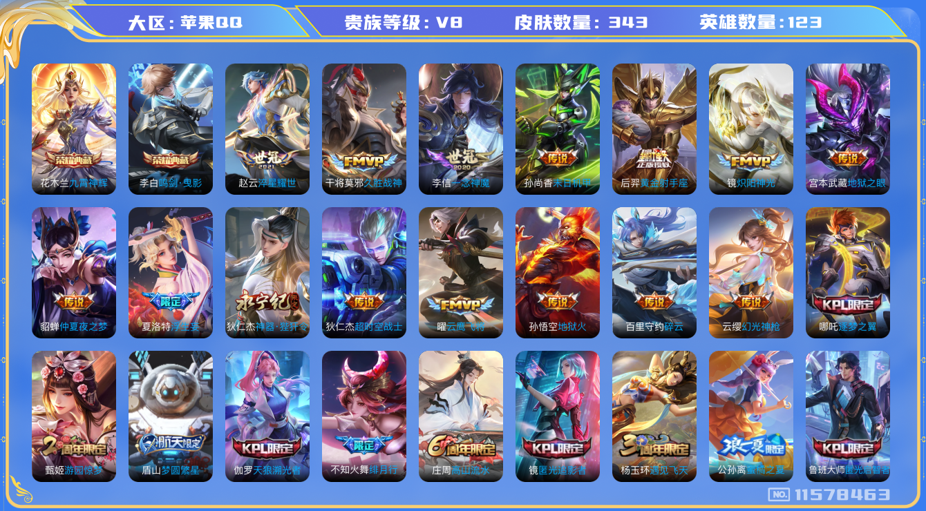 [11578463]V8 2典藏 21传说 123英雄 343皮肤 可修改实名 连体和平 优质装备:鸣剑·曳影,九霄神辉(木兰典藏),黄金射手座,云鹰飞将(小将军),久胜战神,炽阳神光,一念神魔,末日机甲-孙尚香(绿蚂蚱),地狱火,仲夏夜之梦(大飞蛾),地狱之眼,淬星耀世,超时空战士-狄仁杰,碎云,神器·狴犴令,浮生妄 传说皮:幻光神枪 珍宝阁皮:优雅恋人,女武神 限定皮:凤求凰(白切鸡),傲雪梅枪,星穹之声,绯月行,神威(电光马子),飞衡(韩信年限),山海·碧波行(瑶年限),遇见飞天,高山流水,五谷丰年,冰锋战神,游园惊梦,梁祝,天狼狩猎者,逐梦之翼,天狼溯光者,李小龙,逐梦之影,朱雀志(守约年限),霸王别姬-虞姬,默契交锋-花木兰,孙行者,大圣娶亲,青春决赛季,蜜橘之夏,匿光追影者,深海之息(深海大菠萝),枫霜尽,匿光启智者,时之奇旅-妲己,梦圆繁星 史诗皮:遇见神鹿,紫霞仙子,苍穹之光,白龙吟,黄金分割率,特工魅影,千年之狐,魅语,无限星赏官,匿光破解者,冰冠公主,偶像歌手,龙骑士(小龙虾),末日机甲-吕布,猫狗日记-孙策,猫狗日记-大乔,乱世虎臣,节奏热浪,修罗,女仆咖啡,摇滚巨星,水果甜心,绅士熊喵,天才门将,星夜王子,心灵骇客,时之奇旅-安琪拉,功夫厨神,德古拉伯爵,暗隐猎兽者,幽灵船长,鬼剑武藏,心灵战警,天秀·启明,舞动绿茵,地狱岩魂,纤云弄巧,繁星吟游(呼啦呼啦),拒霜思,缤纷独角兽,乘风破浪,逐浪之夏,水晶猎龙者,曙光守护者,箭羽风息,金属风暴,原初追逐者,圣诞狂欢,圣诞恋歌,鹰眼统帅,暗夜贵公子,魅力维加斯,黎明之约,赏金猎手,无心,未来纪元-赵云