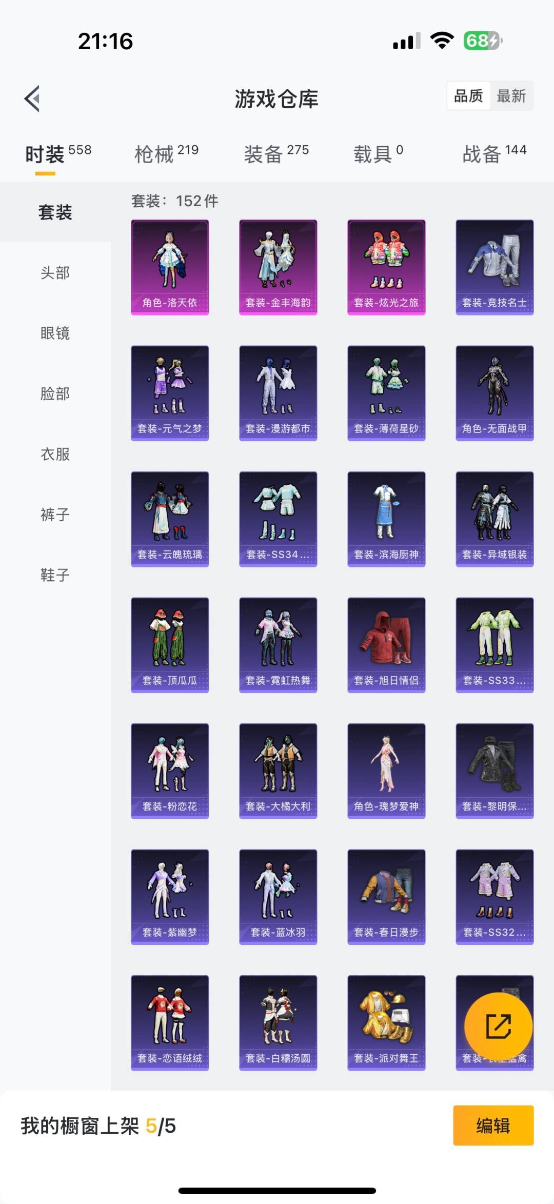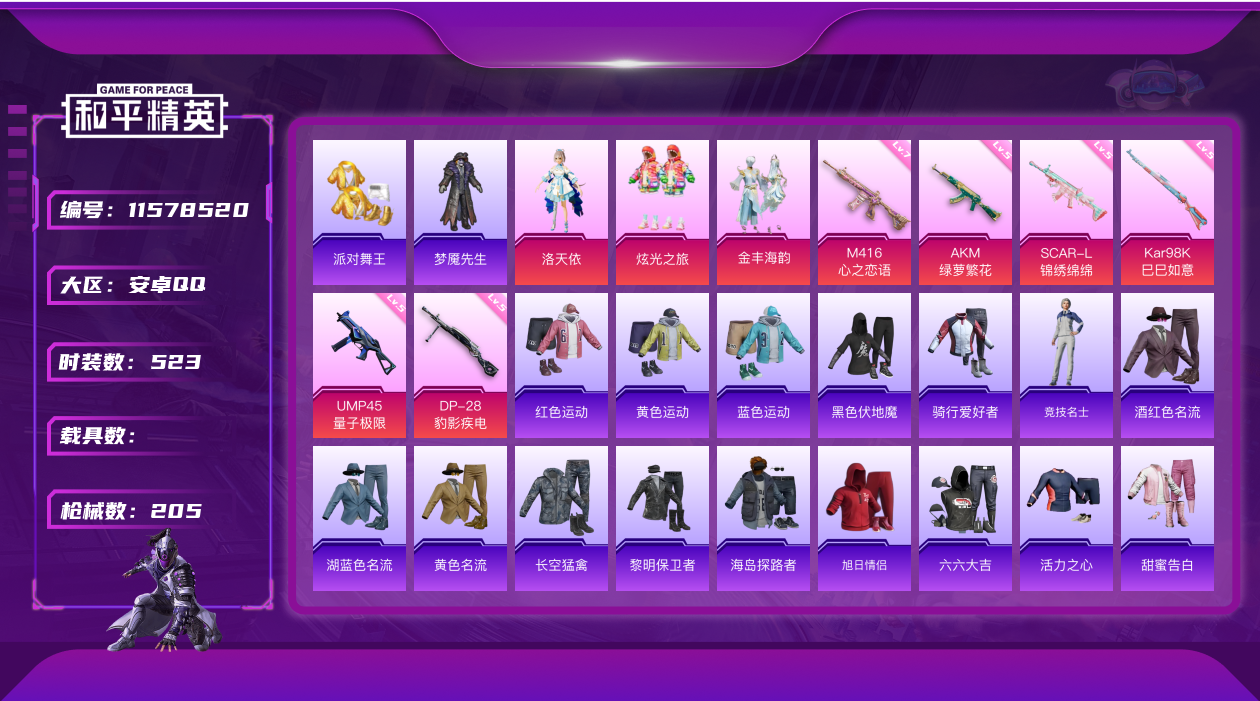 [11578520]3粉装 6特效枪 12印记 可二次 可修改实名 身法装备:舞王派对(派对舞王、小金鞋),8号机(新粉螳螂) 优质装备:舞王派对(派对舞王、小金鞋),M416心之恋语,洛天依,AKM绿萝繁花,SCAR-L-锦绣绵绵,七级M416-心之恋语,UMP45量子极限,Kar98K-巳巳如意 热门装扮:炫光之旅,金丰海韵,梦魇先生,派对舞王(小金鞋) 稀有枪皮:DP-28-豹影疾电 五级特效枪:五级UMP45-量子极限,五级Kar98K-巳巳如意,五级DP-28-豹影疾电,五级SCAR-L-锦绣绵绵,五级AKM-绿萝繁花 紫色装扮:田园牧歌,轻风白浪,和煦暖阳,SS22特训,SS23特训,幻彩翩翩,妙红点点,娇憨猪猪,萌趣咩咩,SS21特训,绚烂繁星,SS31特训套装,六六大吉,冰川特警,霓虹热舞,旭日情侣,SS30特训套装,SS33特训套装,青涩时光,顶瓜瓜,SS20特训,SS16特训,萌趣颜团子,特种颜团子,猎梦纪元,飞驰魅影,音速流光,SS19特训,竞技角斗士,覆海蛟龙,甜心亚梦,虚音幻奏,瑞龙福将,团圆交子,SS17特训,冰川谧蓝,异彩先驱,SS18特训,都市漫游者,酒红色名流,野性战心,长空猛禽,霓虹极客,霓虹街区,缤纷果语,蓝色运动,虎虎生威吉莉,无面战甲,飞行日记,龙腾端午,骑行爱好者,鹤鸣,黄色名流,黄色运动,黎明保卫者,黑色伏地魔,龙的传人,龟仙人,冰河战士,龙魂突击队,蝶变,香桃花海,柠萌假日,沙漠兵团,活力之心,海岛探路者,滨海假日,幻影武者,幻世战舞者,探宝勇士,湖蓝色名流,滨海厨神,破晓战魂,甜蜜告白,福星高照,空岛之星,空投萌叽,红色运动,王牌教练,灰色格斗者,炫蓝之夏,热血青春,小熊娃娃,雏菊兔兔,萝兰蝴蝶,SS29特训,先驱飞行员,星途旅人,创世·幻影,纯真浪花,热情海星,曼妙人鱼,SS28特训,8号机(新粉螳螂),异域银装,鱼渊荷华,玉兔迎春,燕燕于飞,巳巳如意,风玲,青团波波,糖糖葫芦,棉花软糖,竞技名士,街头风暴,银尘,惊鸿侠骨,SS24特训(SS24特训套装),SS25特训,绝对偶像,金戈铁马,锦衣飞扬,粉红小猪,焰鹰斗篷,幻羽潜行,幽夜迷踪,SS27特训,明鸳圣池,日照花林,SS26特训,春光漫游,快闪甜心,贝斯之夜,智谋强哥,大橘大利,耀粉歌者,春日漫步,粉恋花,蓝冰羽,紫幽梦,SS32特训服(SS32特训套装),瑰梦爱神,绯格组合