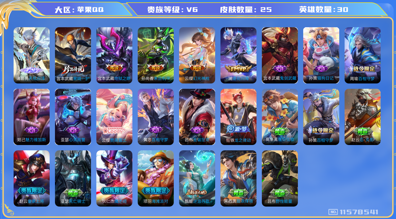 [11578541]V6 1无双 1珍品传说 4传说 30英雄 25皮肤 可修改实名 优质装备:天机白泽,黑崎一护,末日机甲-孙尚香(绿蚂蚱),地狱之眼,澜逐花归海 传说皮:幻光神枪 史诗皮:赞萌露比,龙之律动,百相守梦-周瑜,百相守梦-黄忠,猫狗日记-孙策,鬼剑武藏,心灵战警,圣诞狂欢,魅力维加斯