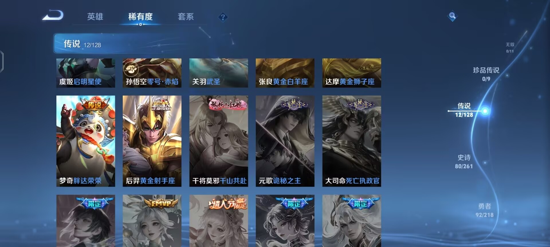 - [11530318]V9 3典藏 1珍品传说 26传说 126英雄 324皮肤 典藏英雄武则天 可修改实名 优质装备:倪克斯神谕(宇宙婆娘),鸣剑·曳影,弑枪猎影(韩信典藏),怪盗基德,黄金狮子座,冠军飞将,猫影幻舞,久胜战神,炽阳神光,一念神魔,地狱火,仲夏夜之梦(大飞蛾),零号·赤焰,海洋之心,地狱之眼,李逍遥,挚爱之约,无双飞将 传说皮:祥瑞亨通,幻光神枪 珍宝阁皮:优雅恋人,蔷薇恋人 限定皮:愿照·岁时盈(虞姬年限),愿照·山河定(司空震年限),鸣野蒿,白虎志(电光耗子),凤求凰(白切鸡),凤凰于飞,太华(伽罗年限),时雨天司(水龙头),神威(电光马子),飞衡(韩信年限),高山流水,五谷丰年,梁祝,祈雪灵祝(雪兔子),天狼绘梦者,李小龙,朱雀志(守约年限),辉光之辰,如梦令-后羿,大圣娶亲,天魔缭乱 史诗皮:鸭鸭历险记-刘禅,星界战将,龙之律动,茶境仙,怒海争锋,炽弈燎原,紫霞仙子,苍穹之光,电玩小子(小书包),白龙吟,黄金分割率,特工魅影,千年之狐,百相守梦(关羽),电玩·爆裂旋风,高渐离燃音魔法,蒙恬荣光圣徽,偶像歌手,龙骑士(小龙虾),暗夜猫娘,魅语,末日机甲-吕布,乱世虎臣,节奏热浪,修罗,女仆咖啡,摇滚巨星,水果甜心,绅士熊喵,天才门将,星夜王子,心灵骇客,功夫厨神,德古拉伯爵,暗隐猎兽者,幽灵船长,鬼剑武藏,暗渊魔法,心灵战警,天秀·启明,舞动绿茵,纤云弄巧,繁星吟游(呼啦呼啦),缤纷独角兽,乘风破浪,逐浪之夏,水晶猎龙者,曙光守护者,箭羽风息,金属风暴,原初追逐者,圣诞狂欢,圣诞恋歌,鹰眼统帅,魅力维加斯,黎明之约,赏金猎手,无心,未来纪元-赵云