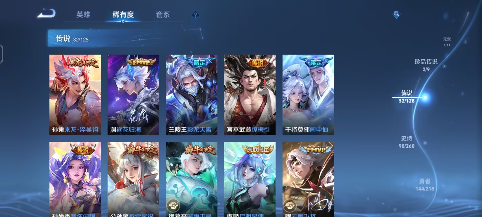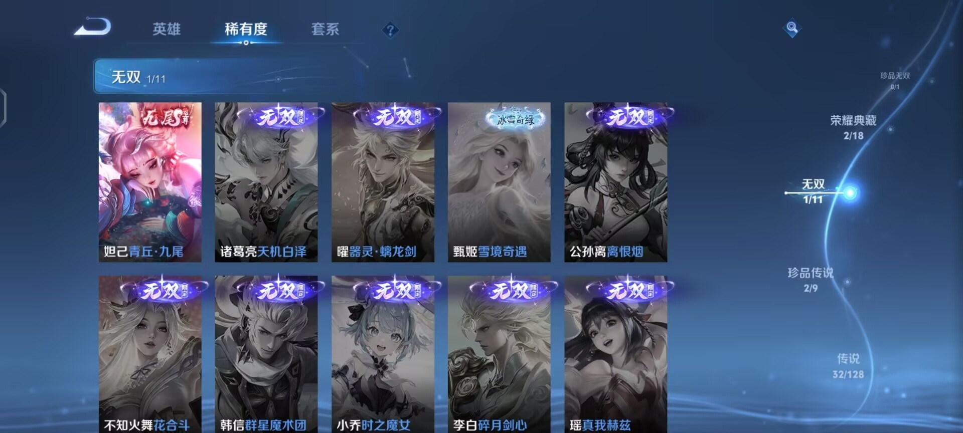 - PX_2085578-93 安卓QQ/最强王者/264皮肤/124英雄/2典藏/0珍品无双/1无双/1珍品传说/15传说/72史诗/8稀有英雄 【1 珍品传说】怪盗基德 马可波罗, 【2 典藏皮肤】杀手不太冷 孙尚香,拾光映像 瑶, 【1 无双皮肤】真我赫兹 瑶, 【15 传说皮肤】启明星使 虞姬,云鹰飞将 曜,游龙清影 西施,猫影幻舞 貂蝉,仲夏夜之梦 貂蝉,时雨天司 诸葛亮,黄金射手座 后羿,