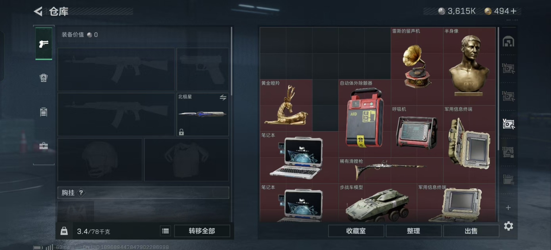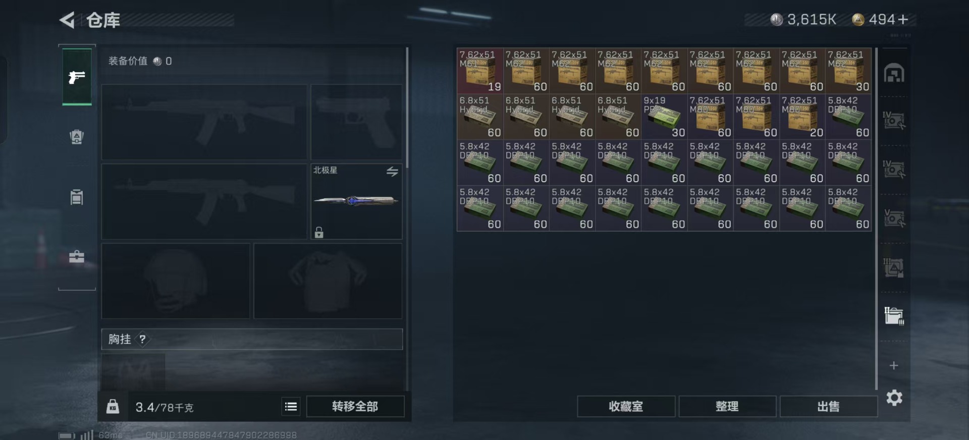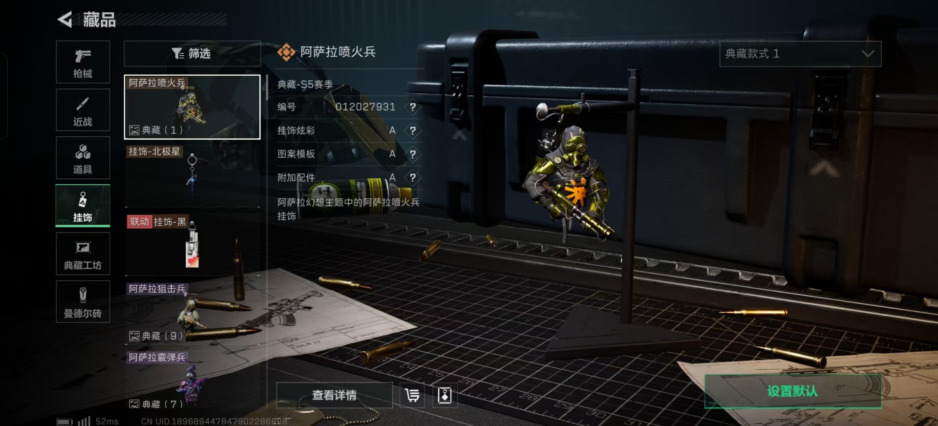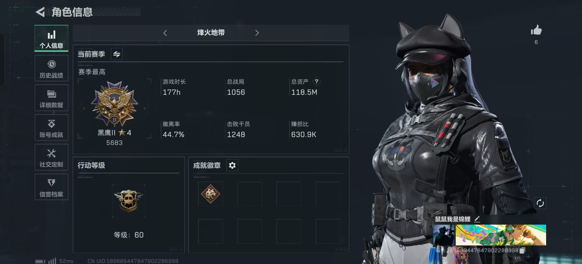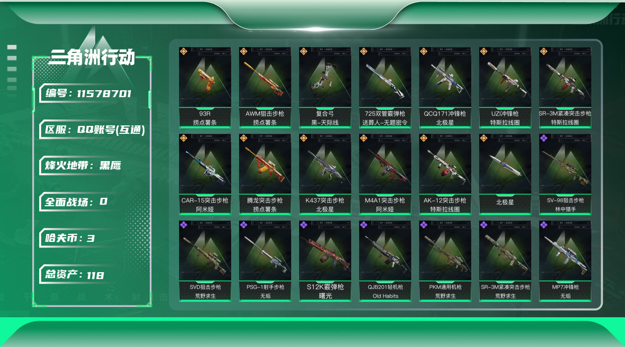[11578701]总资产:118.5M 1干员外观 1近战传说 13传说枪械 哈夫币:3.615K 高级安全箱(9.16到期) 可二次 可修改实名 优质装备:近战-北极星 烽火地带段位:黑鹰 全面战场段位:无段位 传说武器皮肤:UZI冲锋枪-特斯拉线圈,AWM狙击步枪-捞点薯条,腾龙突击步枪-捞点薯条,93R-捞点薯条,AK-12突击步枪-特斯拉线圈,SR-3M紧凑突击步枪-特斯拉线圈,复合弓-黑-天际线,K437突击步枪-北极星,QCQ171冲锋枪-北极星,725双管霰弹枪-送葬人-无题密令,M4A1突击步枪-阿米娅,CAR-15突击步枪-阿米娅 史诗武器皮肤:QJB201轻机枪-Old Habits,MP5冲锋枪-深海恐惧,M16A4突击步枪-竞赛选手,SV-98狙击步枪-林中猎手,SCAR-H战斗步枪-囚徒,腾龙突击步枪-无垢,MP7冲锋枪-无垢,PSG-1射手步枪-无垢,SVD狙击步枪-荒野求生,SR-3M紧凑突击步枪-荒野求生,PKM通用机枪-荒野求生,S12K霰弹枪-曙光 干员外观:蜂医-送葬人·无题密令(S5)