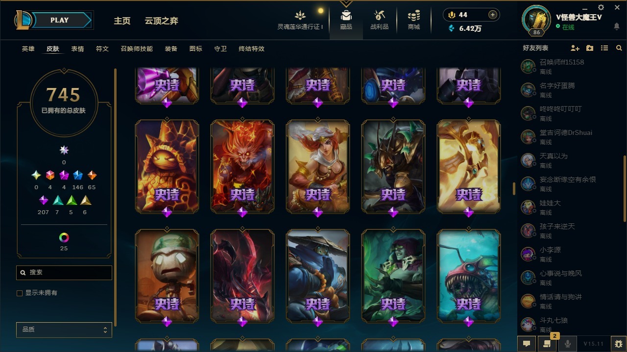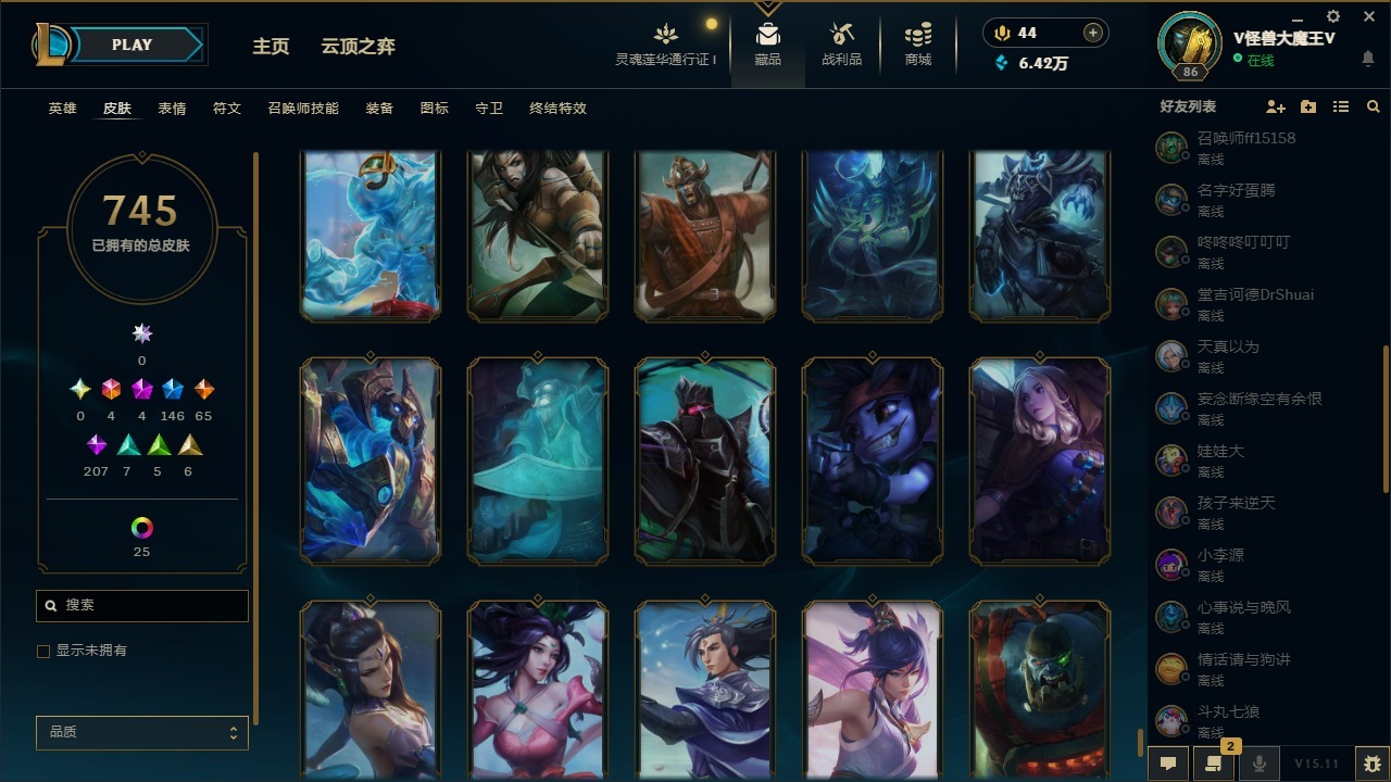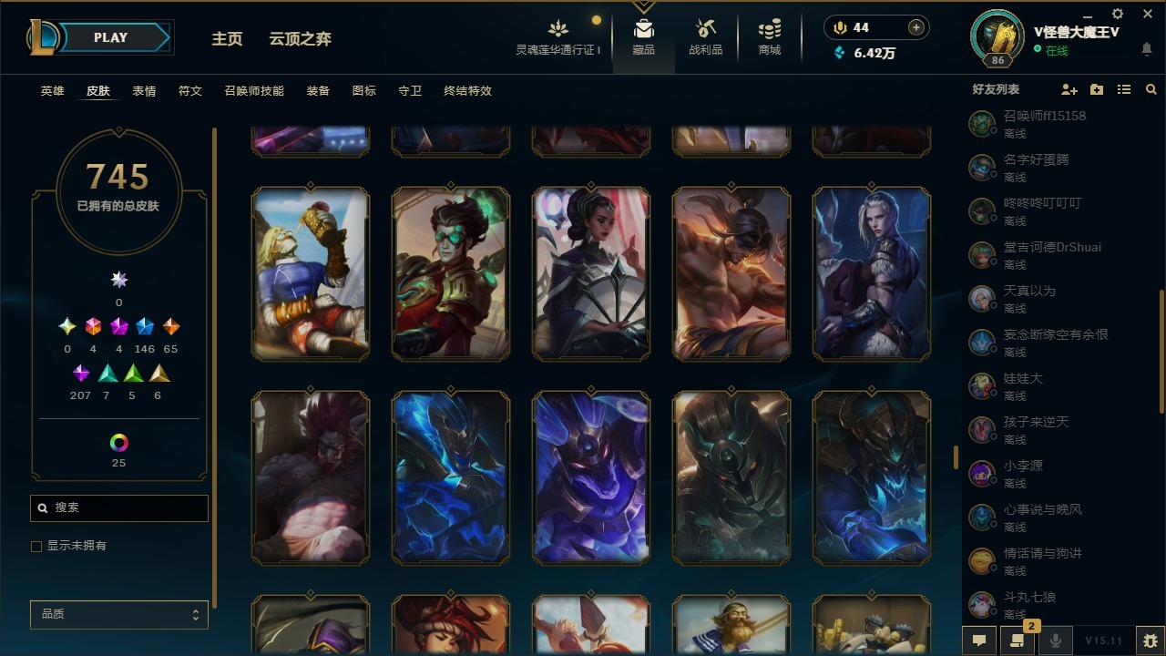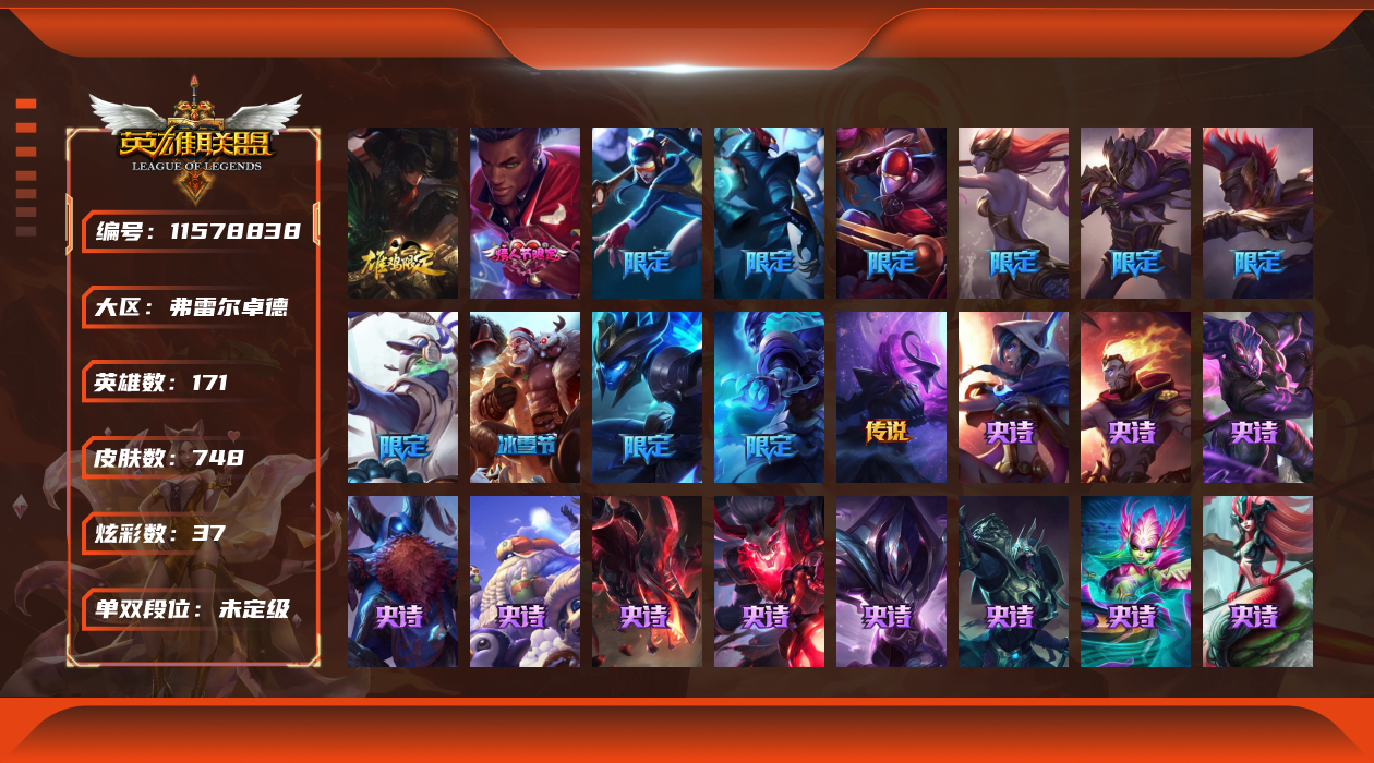 [11578838]可二次 可修改实名 4终极 4神话 8臻彩 146限定 65传说 207史诗 748皮肤 37炫彩 171英雄 翡翠 皮肤:雷霆领主 奥恩,暮星之羽 霞,晨星之翎 洛,巴德·吟游诗人,冰雪游神 巴德,永恒之森 巴德,SKT T1 卡莉丝塔,冠军之矛 卡莉丝塔,腥红之月 卡莉丝塔,泳池派对 雷克塞,上古战魂 雷克塞,抵抗军炎魔 俄洛伊,虚空使者 俄洛伊,暗星 锤石,SSW 锤石,腥红之月 锤石,冠军典狱长 锤石,深渊恐惧 锤石,司马懿 仲达,SKT T1 阿兹尔,幽冥领主 阿兹尔,星际之门 阿兹尔,SKT T1 娜美,海皇姬 娜美,鲛妮座人 娜美,河水之灵 娜美,锦鲤 娜美,狂鲨 亚托克斯,霸天剑魔 亚托克斯,仲裁圣骑 亚托克斯,源计划:裁决 蔚,虎痴之拳 蔚,炼狱魔女 蔚,铁拳执事 蔚,女警官 蔚,霓虹杀拳 蔚,SKT T1 艾克,源计划:自由 艾克,任性学霸 艾克,时之砂 艾克,爵士 克烈,SKT T1 劫,冲击之刃 劫,觅心游侠 卢锡安,源计划:雷 卢锡安,夺命前锋 卢锡安,职业杀手 卢锡安,海牛大大 塔姆,五星大厨 塔姆,圣诞捣蛋鬼 金克丝,丧尸杀手 金克丝,黑帮狂花 金克丝,银河魔装机神 千珏,黯焰双魂 千珏,源计划:升华 烬,SKT T1 烬,黑帮管家 布隆,圣诞老人 布隆,布隆·狮心,猛虎 布隆,屠龙勇士 布隆,源代码 卡蜜尔,弗雷尔卓德 塔莉垭