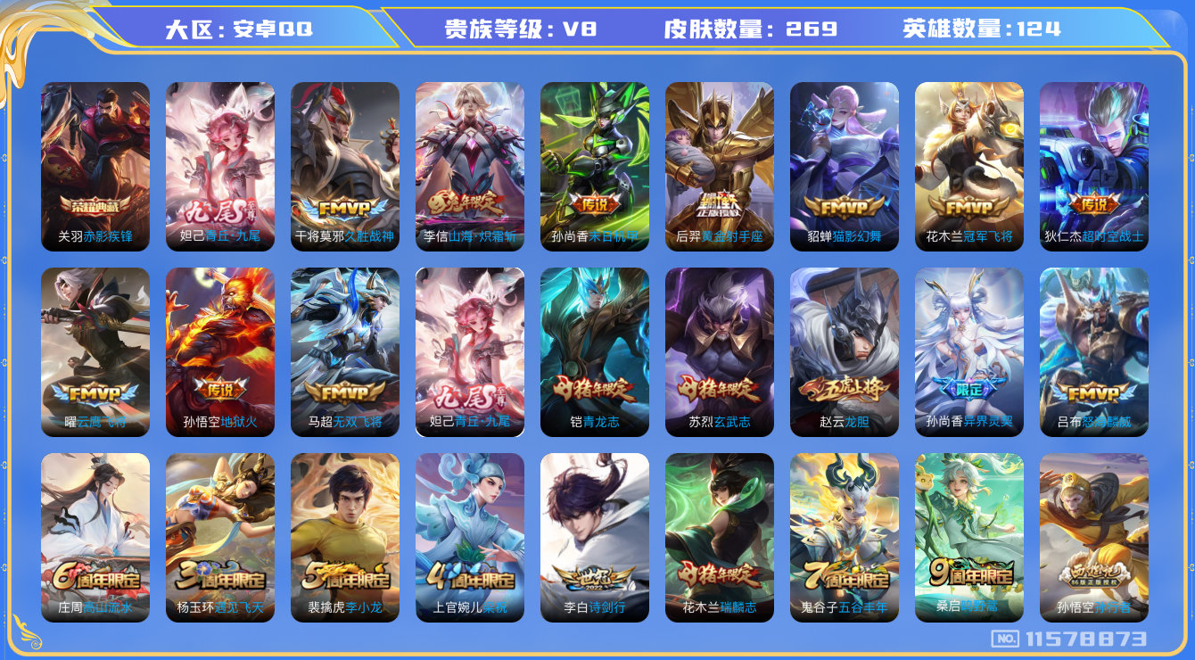 [11578873]V8 1典藏 1无双 16传说 124英雄 269皮肤 可修改实名 优质装备:赤影疾锋,青丘·九尾(妲己无双),黄金射手座,冠军飞将,云鹰飞将(小将军),猫影幻舞,久胜战神,末日机甲-孙尚香(绿蚂蚱),地狱火,超时空战士-狄仁杰,无双飞将,山海·炽霜斩(李信年限),青丘·九尾 珍宝阁皮:妄想食味,优雅恋人,蔷薇恋人 限定皮:鸣野蒿,至尊宝,异界灵契(白毛香),瑞麟志(木兰年限),遇见飞天,高山流水,诗剑行,怒海麟威,五谷丰年,青龙志(铠年限),冰锋战神,武圣,梁祝,龙胆,李小龙,玄武志(苏烈年限),朱雀志(守约年限),孙行者 史诗皮:破空之剑,蒙犽顽岩魄,决胜骁骑,电玩小子(小书包),黄金分割率,特工魅影,魅语,无限星赏官,冰冠公主,百相守梦(关羽),末日机甲-吕布,猫狗日记-孙策,猫狗日记-大乔,时之恋人-孙尚香,乱世虎臣,节奏热浪,修罗,女仆咖啡,摇滚巨星,水果甜心,绅士熊喵,星夜王子,心灵骇客,功夫厨神,德古拉伯爵,暗隐猎兽者,鬼剑武藏,地狱岩魂,纤云弄巧,乘风破浪,逐浪之夏,水晶猎龙者,曙光守护者,箭羽风息,金属风暴,圣诞狂欢,鹰眼统帅,魅力维加斯,无心,未来纪元-赵云