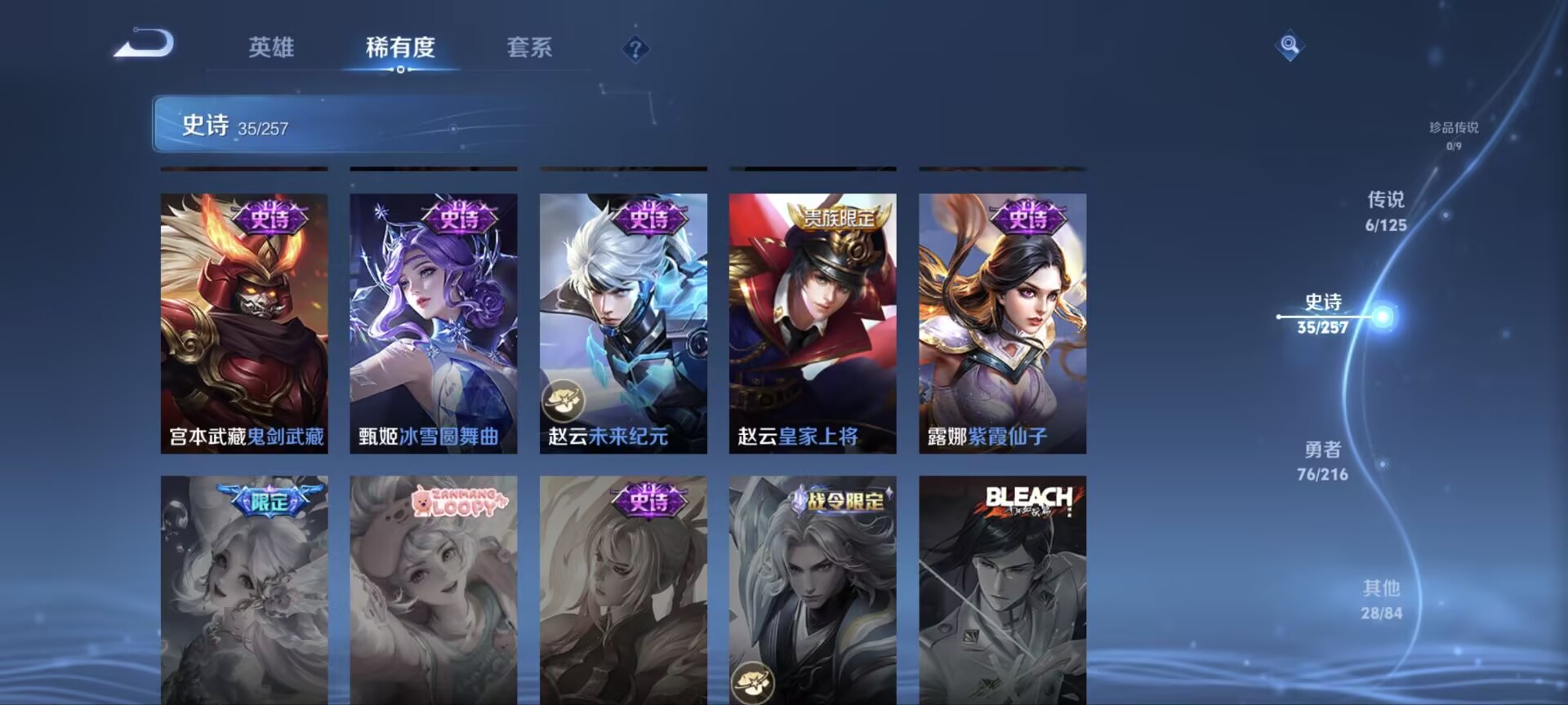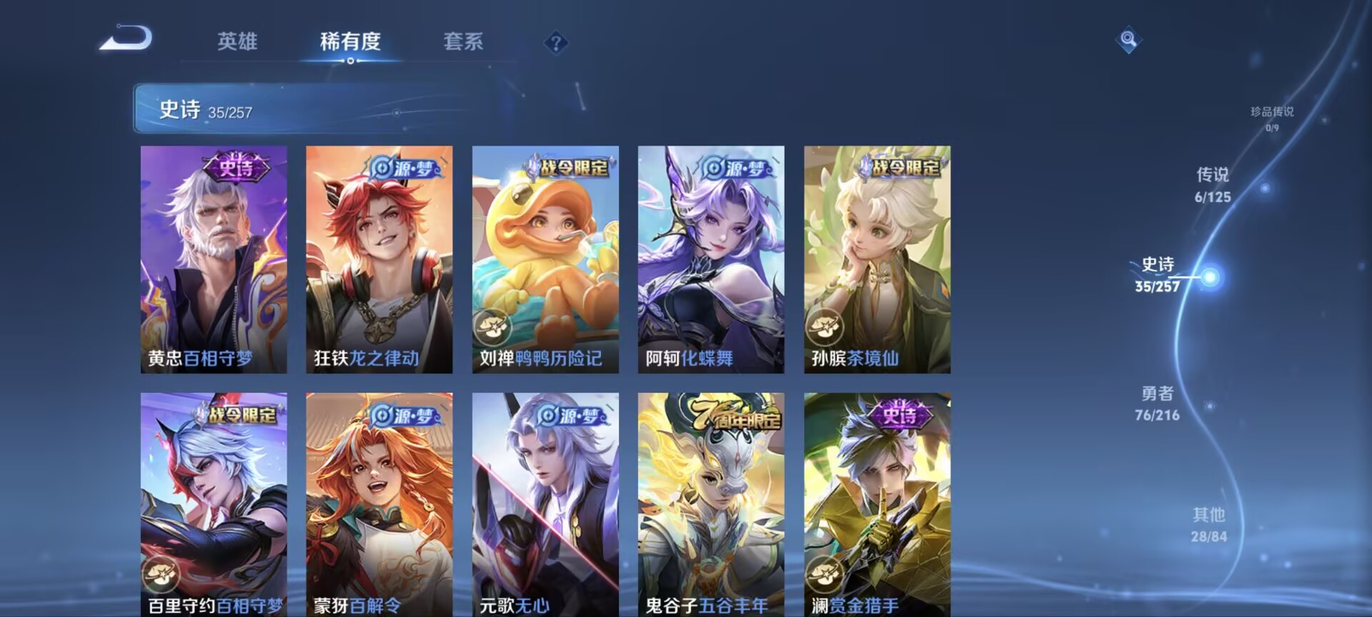 - [36843]英雄数: 83 勇者皮肤数: 46 史诗皮肤数: 10 传说皮肤数: 1 稀有英雄: 艾琳,娜可露露,不知火舞,桑启,戈娅 当前段位: 王者 限定皮肤: 高山流水,五谷丰年 内测皮肤: 女武神 史诗皮肤: 逐浪之夏,水果甜心,乘风破浪,水晶猎龙者 赛季/战令皮肤: 朔风刀,混沌棋,疑决卦,醍醐杖,原初探秘者,万华元夜,演武夺筹,驱傩正仪,千军破阵,星际陆战队(达摩),金庭之子,大漠名商,云中旅人,海盐诗旅 实名: 无人脸修改机会/实名是本人 普通皮肤: 五福同心,龙腾万里,归虚梦演(曜),掌控之力,守护之力,化身博士,缤纷绘卷,黄金武士,天使之翼,红桃皇后,星际陆战队(程咬金),阴阳师,汉昭烈帝,兔女郎,死亡骑士,救世之瞳,白色死神,野性能量,冰雪圆舞曲,露花倒影,花见巫女,未来旅行,龙域领主,蔷薇王座,万圣前夜,异域舞娘,潮流仙人,东海龙王,战争女神,精灵王,死神来了,赤焰之缨,启蛰,棒球奇才,海之征途,精准探案法,花间舞,绝影神枪,阿摩司公爵,特种部队,隐刃,木偶奇遇记,海军大将,一千零一夜,英喵野望,前尘,碧珀绯影