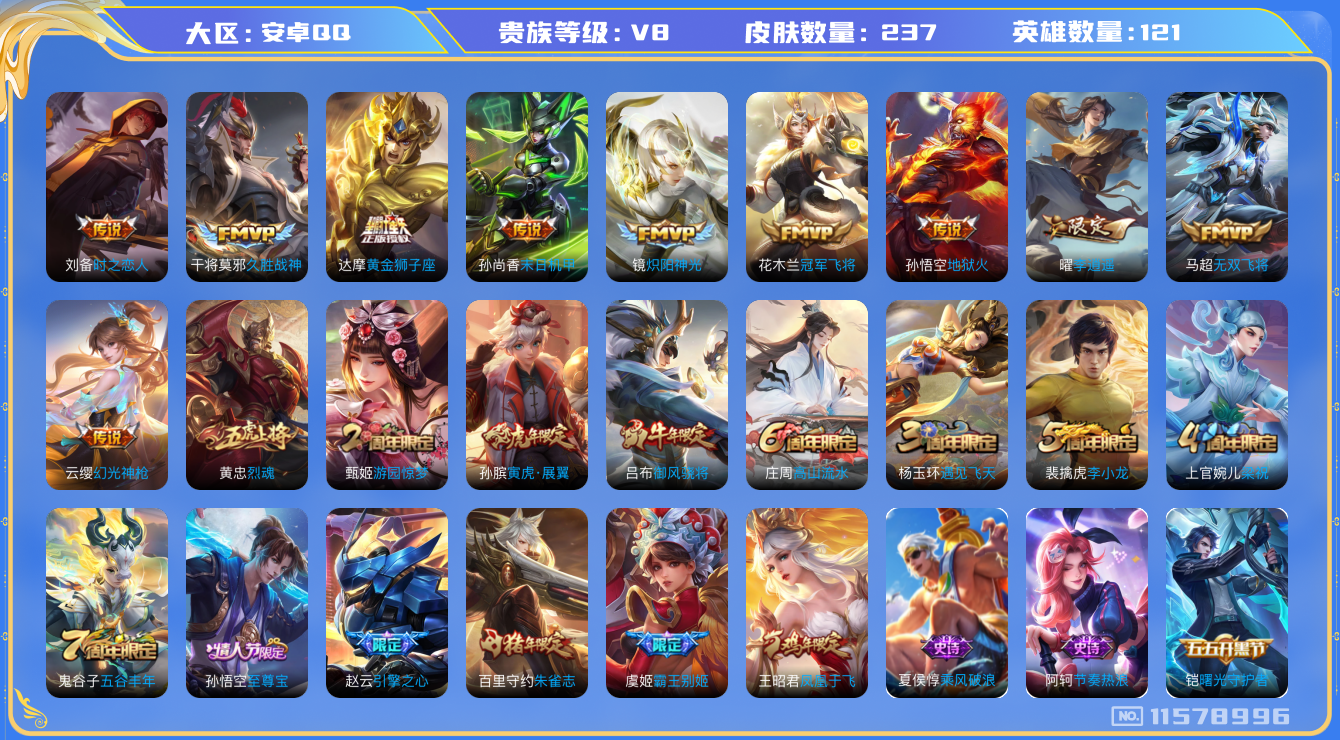 - [11688527]V8 1典藏 11传说 120英雄 197皮肤 可修改实名 优质装备:杀手不太冷,黄金狮子座,久胜战神,一念神魔,末日机甲-孙尚香(绿蚂蚱),零号·赤焰,胖达荣荣,时之恋人-刘备(电焊工) 限定皮:至尊宝,太华(伽罗年限),飞衡(韩信年限),遇见飞天,五谷丰年,武圣,游园惊梦,梁祝,天狼狩猎者,李小龙,逐梦之光,玄武志(苏烈年限),辉光之辰,一生所爱,大圣娶亲,天魔缭乱 史诗皮:白龙吟,黄金分割率,千年之狐,魅语,无限星赏官,冰冠公主,偶像歌手,晚萤,猫狗日记-孙策,时之恋人-孙尚香,修罗,水果甜心,天才门将,星夜王子,功夫厨神,德古拉伯爵,暗隐猎兽者,幽灵船长,鬼剑武藏,舞动绿茵,地狱岩魂,繁星吟游(呼啦呼啦),缤纷独角兽,乘风破浪,水晶猎龙者,曙光守护者,箭羽风息,金属风暴,原初追逐者,鹰眼统帅,暗夜贵公子,魅力维加斯,未来纪元-赵云