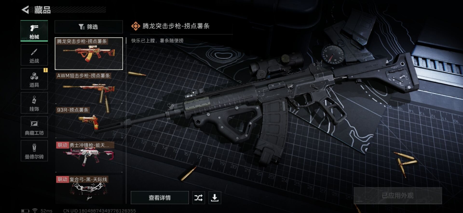[11579010]总资产:36.9M 4传说枪械 哈夫币:20.603K 进阶安全箱(9.16到期) 可二次 可修改实名 烽火地带段位:钻石 全面战场段位:无段位 传说武器皮肤:腾龙突击步枪-捞点薯条,93R-捞点薯条,勇士冲锋枪-能天使-午夜邮差,复合弓-黑-天际线 史诗武器皮肤:M16A4突击步枪-竞赛选手,M250通用机枪-囚徒,SV-98狙击步枪-林中猎手