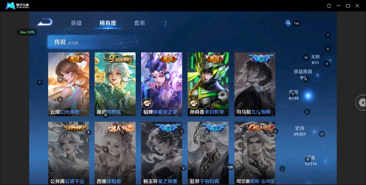 - [11254128]V8 1典藏 1珍品传说 10传说 126英雄 308皮肤 典藏英雄武则天 可修改实名 优质装备:倪克斯神谕(宇宙婆娘),怪盗基德,炽阳神光,地狱火,仲夏夜之梦(大飞蛾),地狱之眼 传说皮:吕布曦玄引,幻光神枪 珍宝阁皮:妄想食味,优雅恋人 限定皮:愿照·九州拓(澜年限),鸣野蒿,至尊宝,凤求凰(白切鸡),凤凰于飞,飞衡(韩信年限),遇见飞天,游园惊梦,梁祝,御风骁将(吕布年限),李小龙,辉光之辰,霸王别姬-项羽,霸王别姬-虞姬,默契交锋-花木兰,孙行者,梦圆繁星 史诗皮:鸭鸭历险记-刘禅,器灵·浮梦炉,化蝶舞,星界战将,灵蛊蚀心,龙之律动,破空之剑,战舞者,遇见神鹿,紫霞仙子,电玩小子(小书包),白龙吟,黄金分割率,特工魅影,千年之狐,江河有灵,百解令(蒙犽),偶像歌手,龙骑士(小龙虾),魅语,冰冠公主,末日机甲-吕布,乱世虎臣,节奏热浪,女仆咖啡,摇滚巨星,水果甜心,绅士熊喵,天才门将,星夜王子,德古拉伯爵,暗隐猎兽者,幽灵船长,鬼剑武藏,心灵战警,乐园奇幻夜,舞动绿茵,地狱岩魂,纤云弄巧,繁星吟游(呼啦呼啦),缤纷独角兽,乘风破浪,逐浪之夏,水晶猎龙者,箭羽风息,金属风暴,原初追逐者,圣诞狂欢,圣诞恋歌,鹰眼统帅,王者之锤,魅力维加斯,黎明之约,未来纪元-赵云